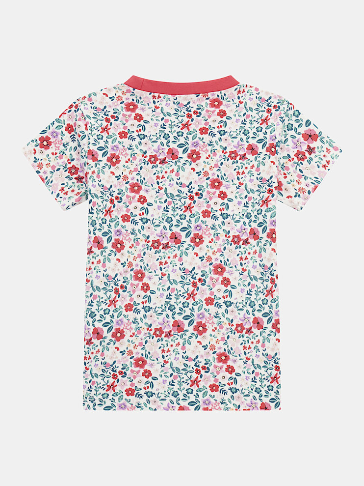 T-shirt con logo per bambina di Guess. Realizzato in morbido jersey di cotone con caratteristico motivo a quattro G all-over, presenta il caratteristico logo triangolare del marchio sul davanti