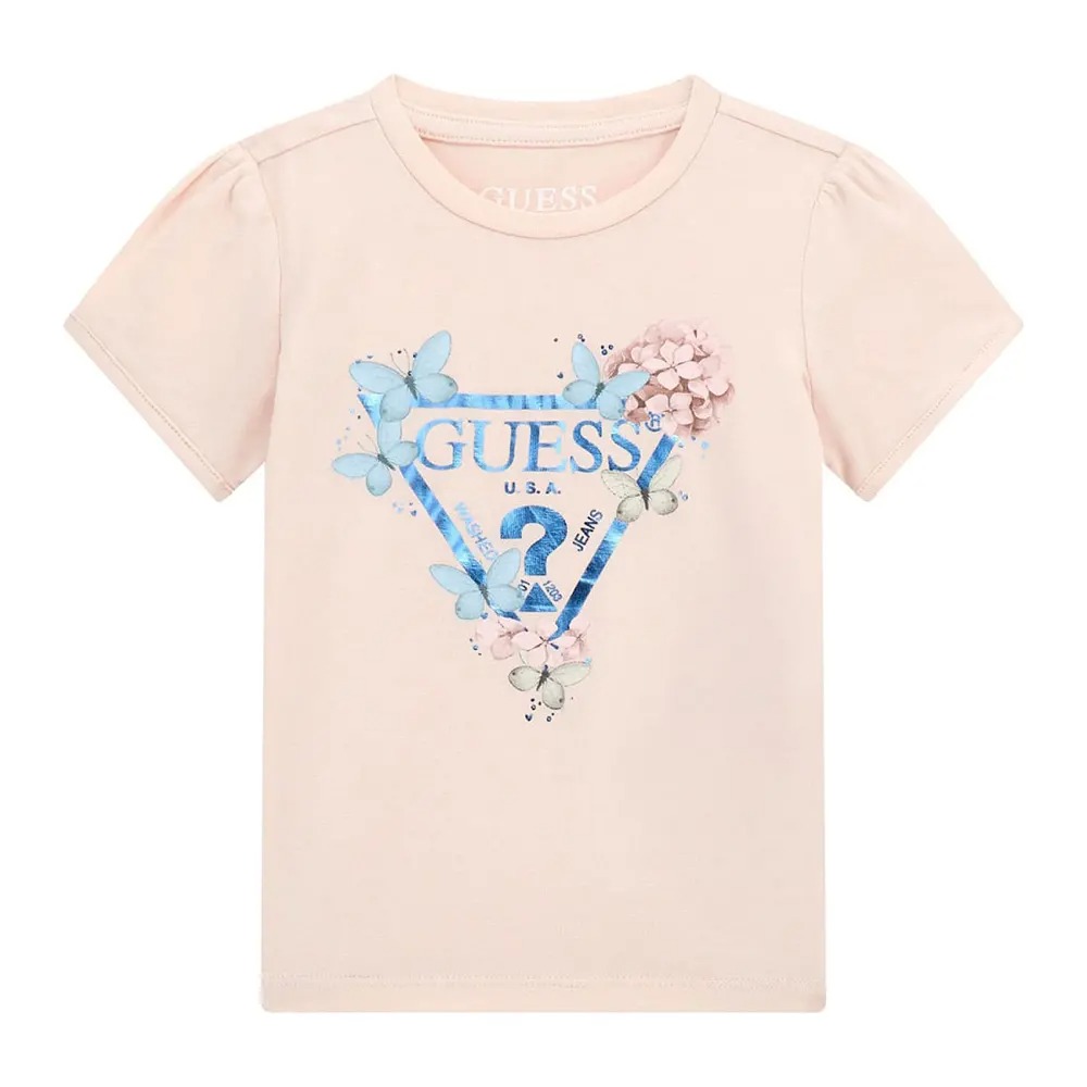 Stampa del logo Guess con farfalle e fiori.