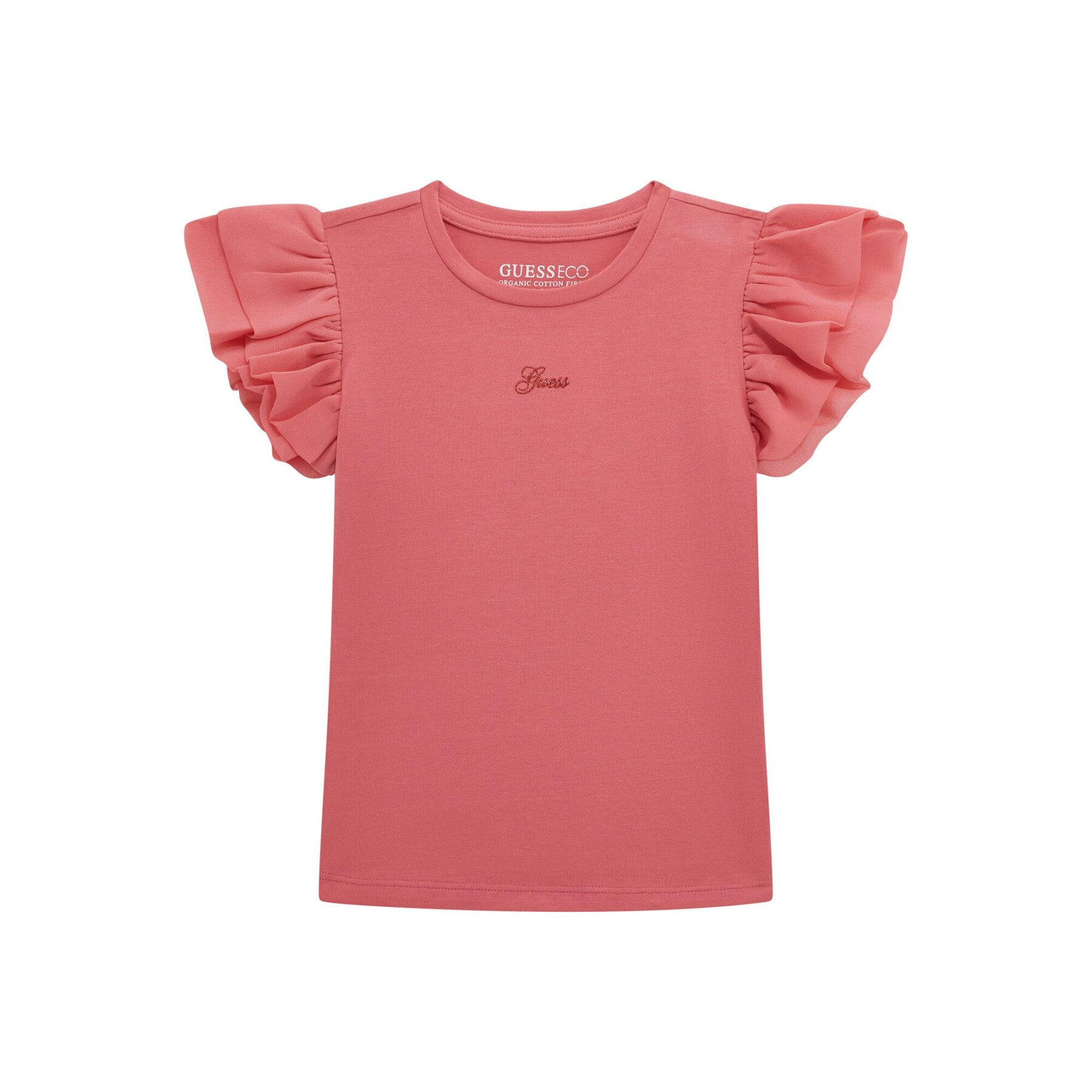 Questo t-shirt con volant in mussola per ragazza del marchio Guess è un must-have per le giovani ragazze alla moda. Realizzato con un tessuto leggero e fluido, questo t-shirt è perfetto per le calde giornate estive. I delicati volant aggiungono un tocco di femminilità e leggerezza a questo capo.