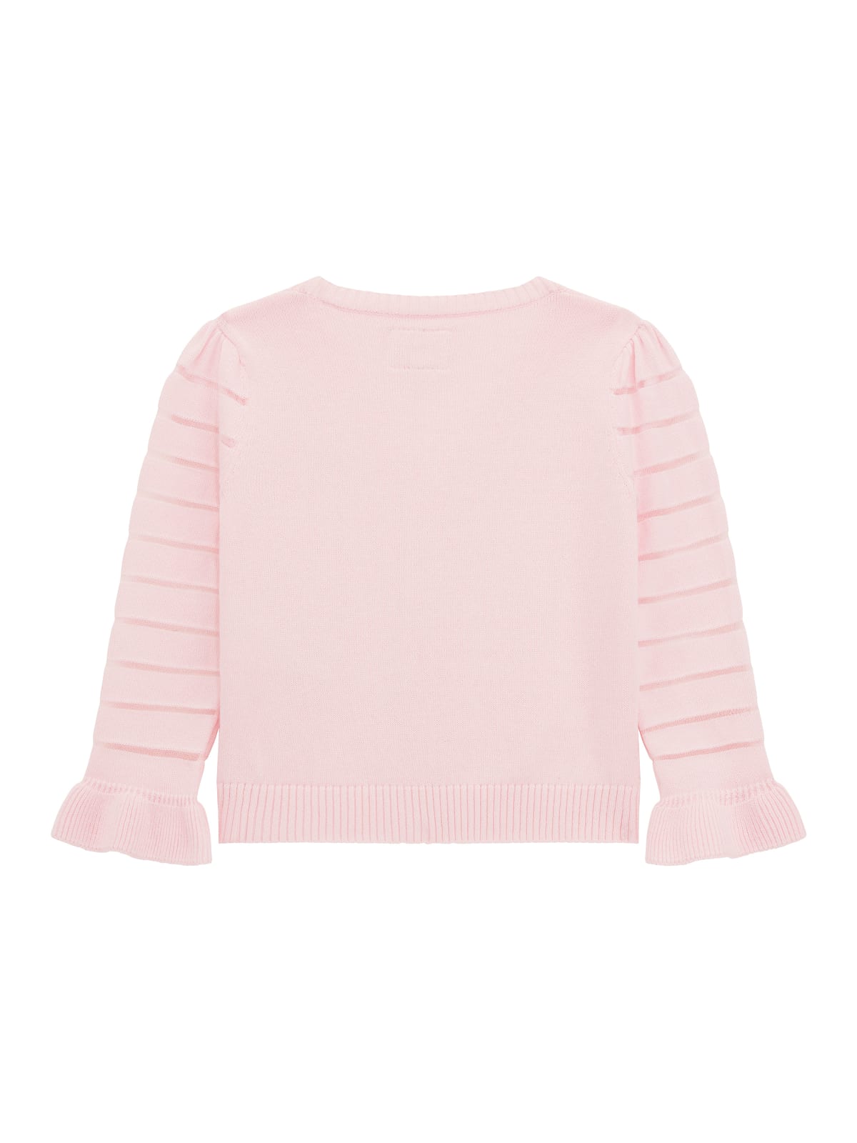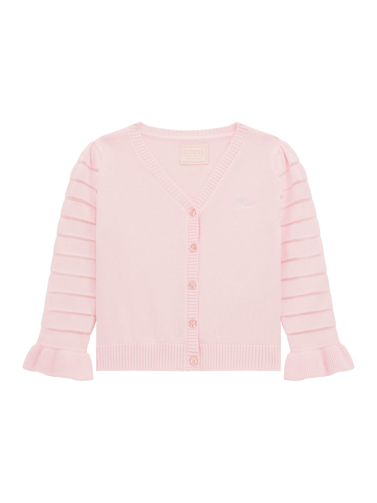 Cardigan Guess color rosa chiaro, modello manica lunga con orlo smerlato a costine, scollo a V con chiusura tramite bottoncini sul davanti, orlo a costine. Dettaglio righe tono su tono sulle maniche