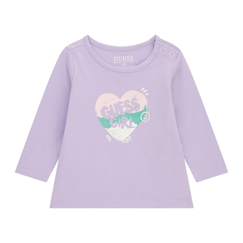 Blusa viola a maniche lunghe con stampa floreale a cuori davanti per bambina Guess. Realizzato in cotone pregiato di alta qualità. Materiale molto morbido e piacevole al tatto. Stampa a colori sul davanti con glitter e branding. Adatto per lo stile di tutti i giorni e qualsiasi combinazione.