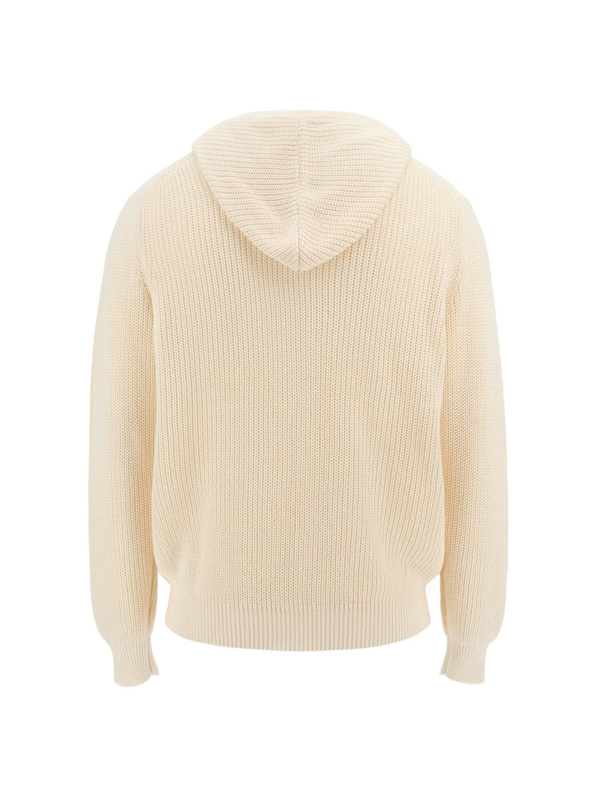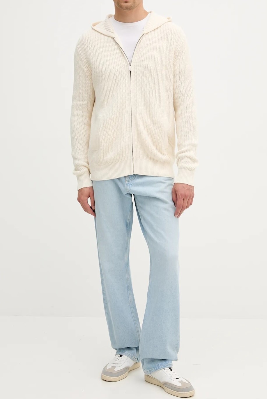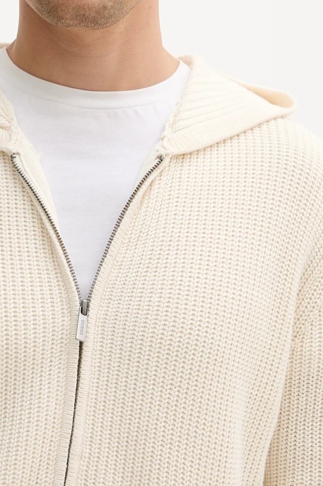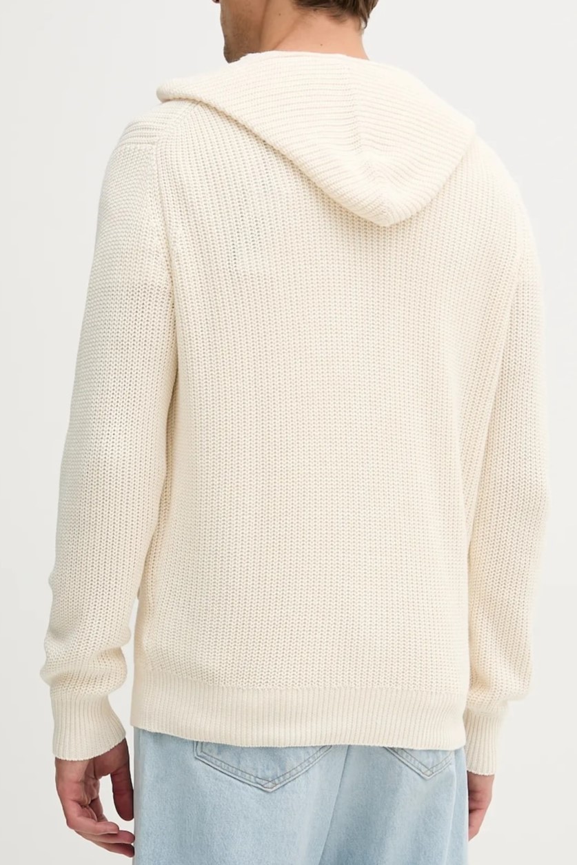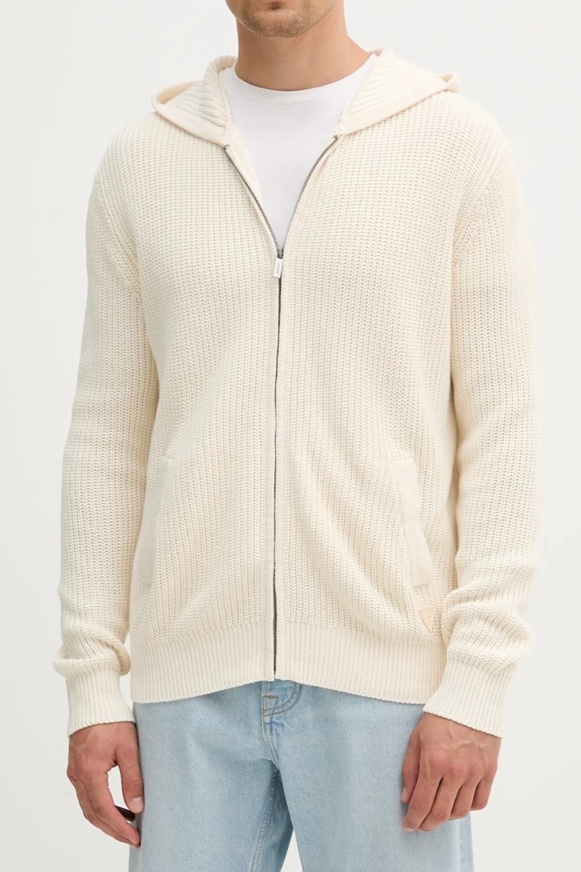Cardigan con cappuccio a maglia tinta unita. Il modello realizzato in un tessuto estremamente confortevole ad alta percentuale di cotone.