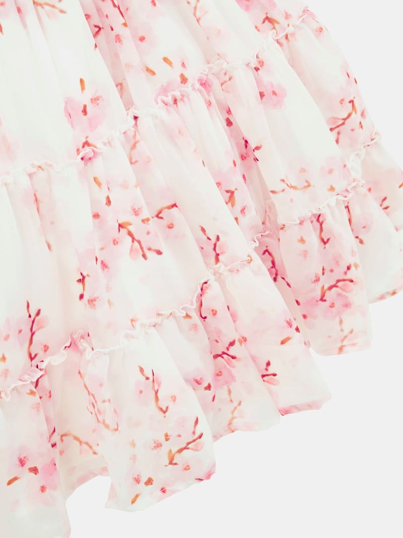 Abito per bambina con parte superiore con colletto a polo, logo in lettering posto nella parte frontale, tasche sul petto, maniche corte, gonna con fantasia mista multicolore, dettaglio cintura su vita
