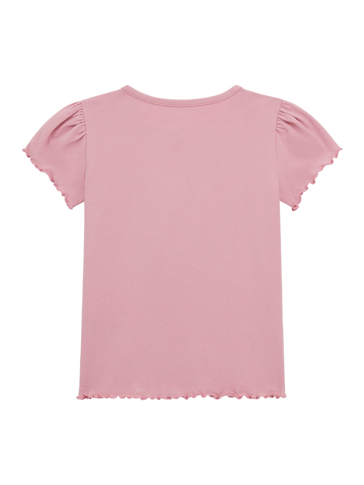 T-shirt Guess da bambina. Modello girocollo e mezza manica a palloncino con orlo smerlato. Dettaglio stampa maxi logo lettering glitter contornato da cuore sul davanti