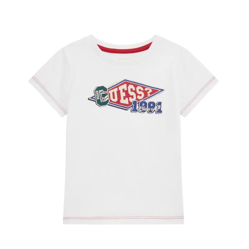 T-shirt a maniche corte per bambino con scritta Guess in contrasto. Realizzato in cotone pregiato di alta qualità. Ampia stampa a contrasto sul davanti. Design adatto a tutti i giorni. Si abbina facilmente a un'ampia gamma di vestiti.