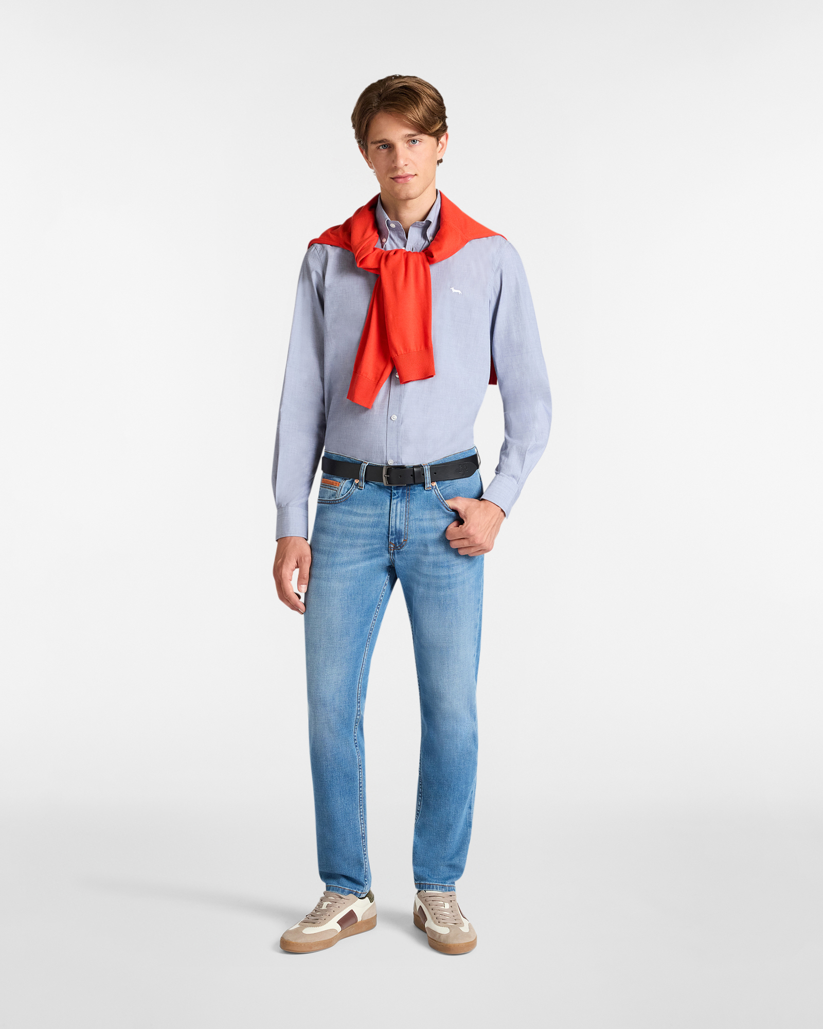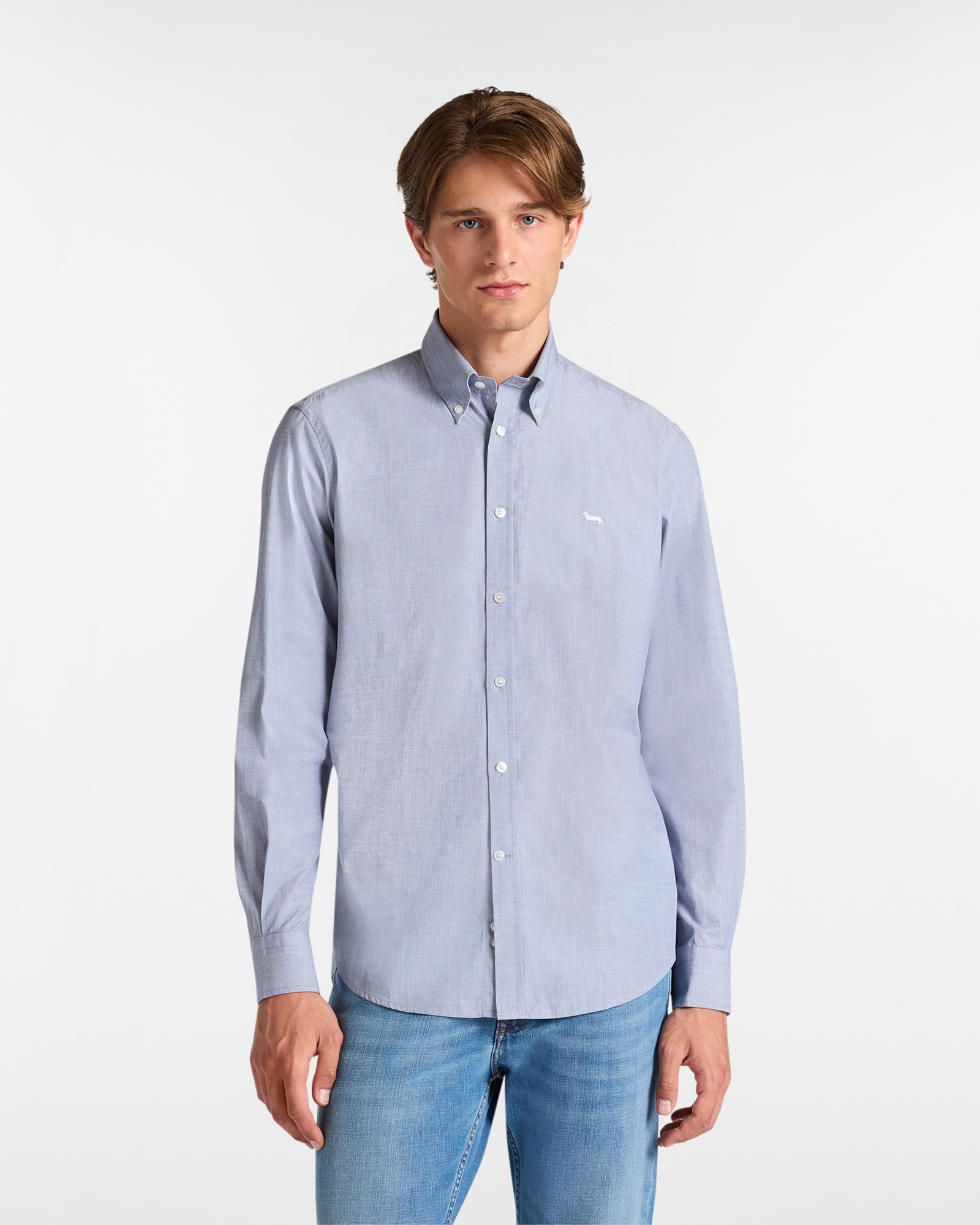 Harmont & Blaine firma una camicia da uomo in leggero cotone fil-à-fil dalle linee pulite ed essenziali e dalle tonalità delicate che diventerà un autentico must-have del vostro guardaroba quotidiano. Il modello è presentato in una confortevole vestibilità regular, ed è dotato di un pratico collo con bottoncini, mentre il tocco di stile del brand è dato dall'iconico bassotto ricamato sul petto e dagli interni a contrasto nei polsi e nel sottocollo.