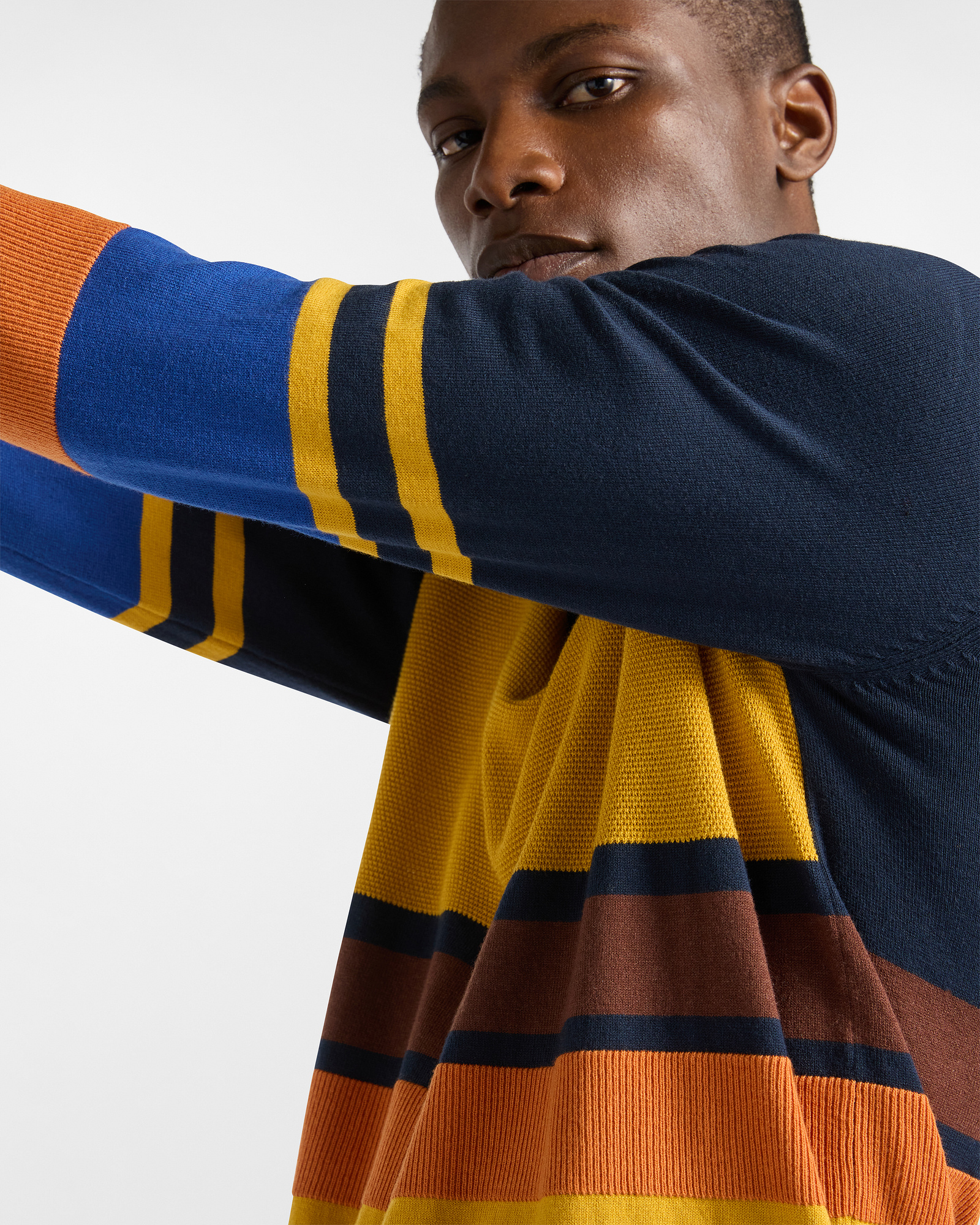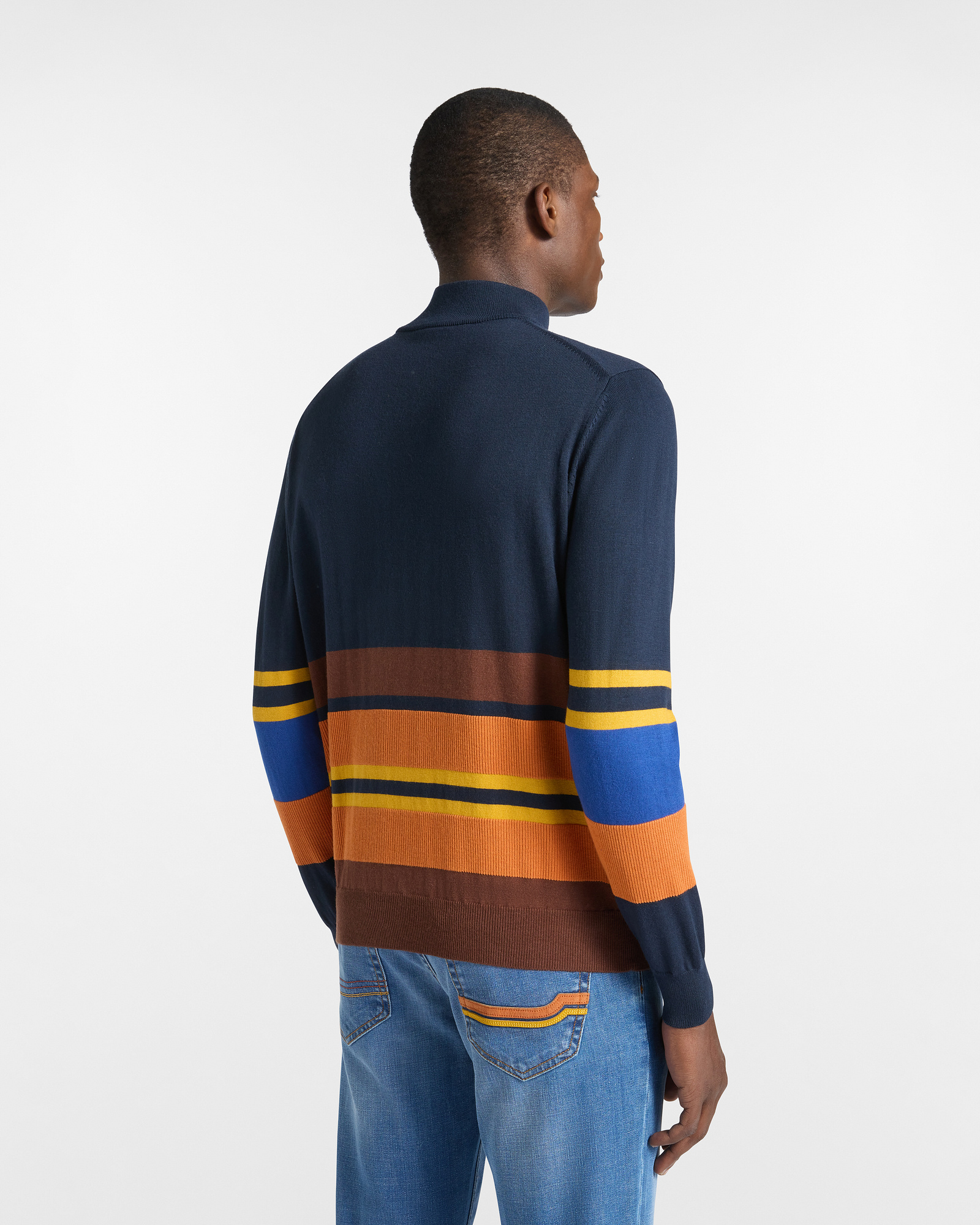 Harmont & Blaine firma un pullover da uomo realizzato in un morbido e confortevole mix di cotone e lana ideale per completare i vostri outfit casual della stagione fredda. Il capo è caratterizzato da un collo in piedi con zip, ed è ravvivato dal tocco di brio tipico del brand: un motivo a righe multicolor di diverso spessore e una lavorazione a costine che coinvolge parte del motivo, collo, polsini e fondo. Il modello, presentato in una confortevole vestibilità regular, è rifinito dal ricamo dell'iconico bassotto sul petto.