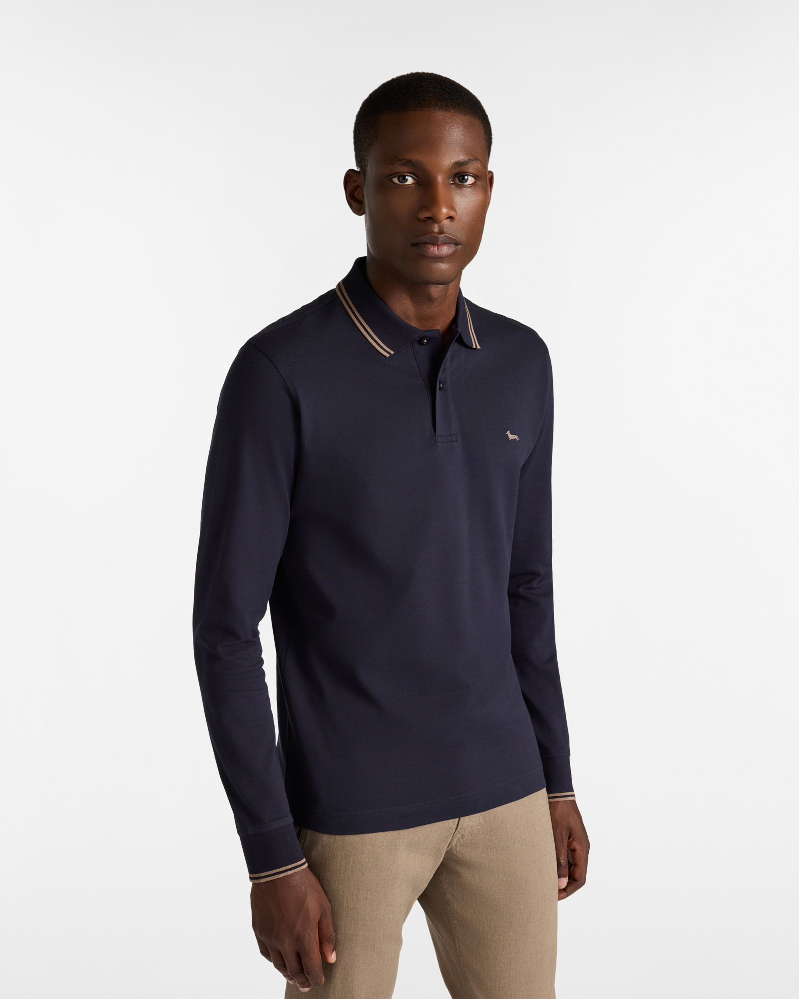 Harmont & Blaine presenta una polo da uomo a maniche lunghe estremamente versatile realizzata in piquet di 100% cotone mercerizzato e proposta in una vestibilità narrow, un fit leggermente più aderente. La polo è impreziosita da sottili righe a contrasto, situate in corrispondenza dell'estremità del collo e del fondo manica, ed è rifinita dall'immancabile bassotto Blaine ricamato sul petto nella stessa tonalità delle righe.