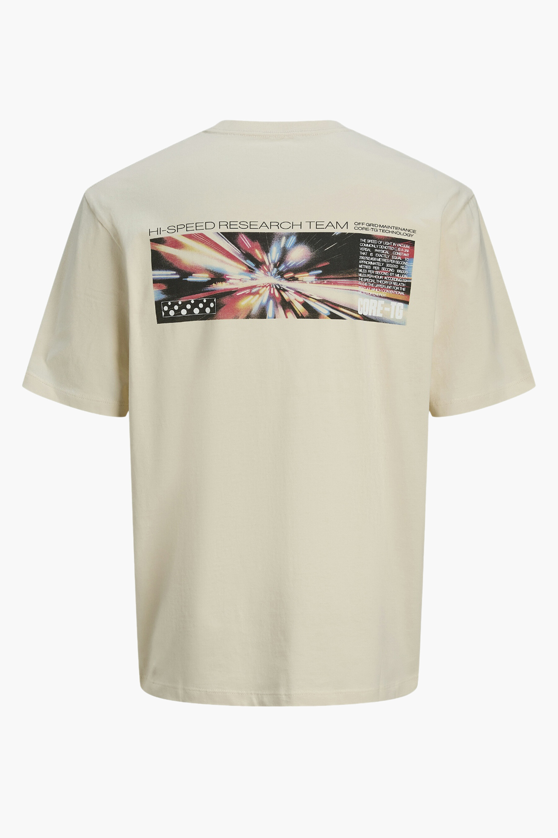 T-shirt a maniche corte con lettering a contrasto colore centrale e fantasia multicolore posta nella parte posteriore, orlo dritto, vestibilità comoda