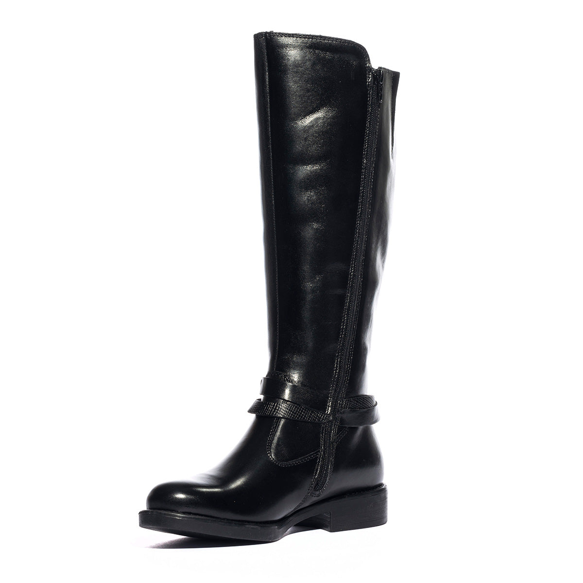 Stivali per donna in pelle dall'effetto lucido, lacci in pelle posti in fondo, suola con tacco, punta arrotondata