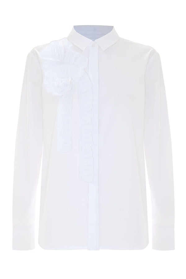 Camicia a maniche lunghe classic fit,colletto a punta, abbottonatura nascosta. Il capo è impreziosito sul davanti da un raffinato gioco di volant.