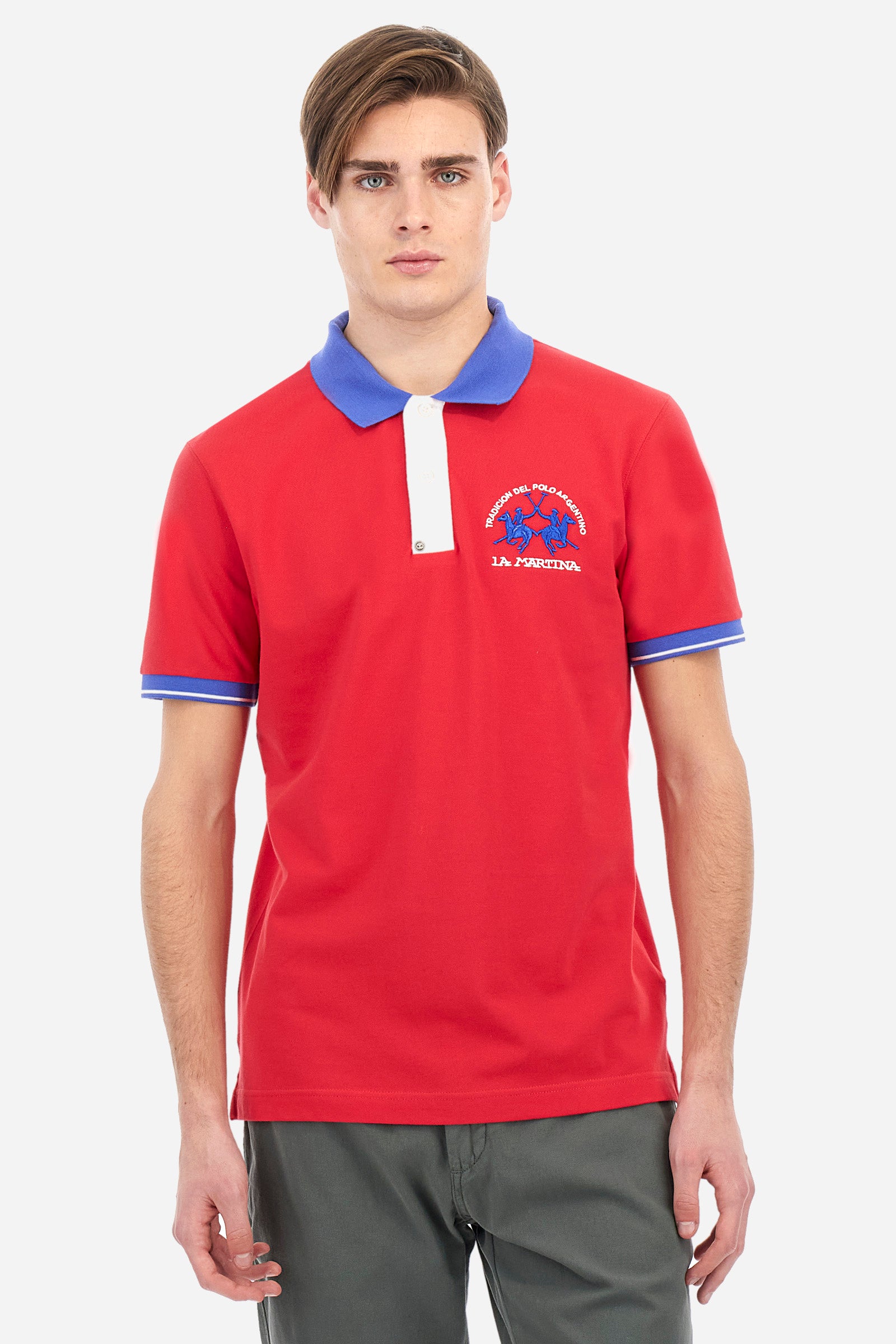 "Polo piquet stretch" uomo La Martina con profili a contrasto di colore, in jersey di cotone stretch, maniche corte, colletto classico chiuso da bottoni logati, spacchetti laterali al fondo, maxi logo a ricamo sul petto, bordi a costine,slim fit.