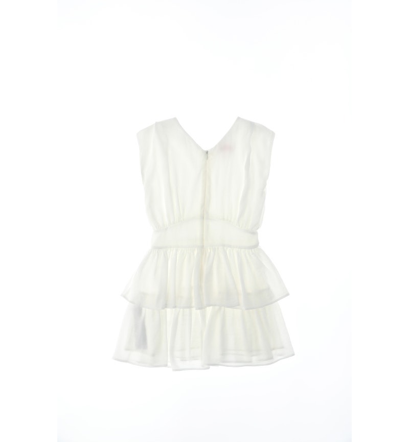 Abito smanicato con scollo a V, chiusura sul retro con zip, balze sul fondo, targhetta logo cucita sul davanti