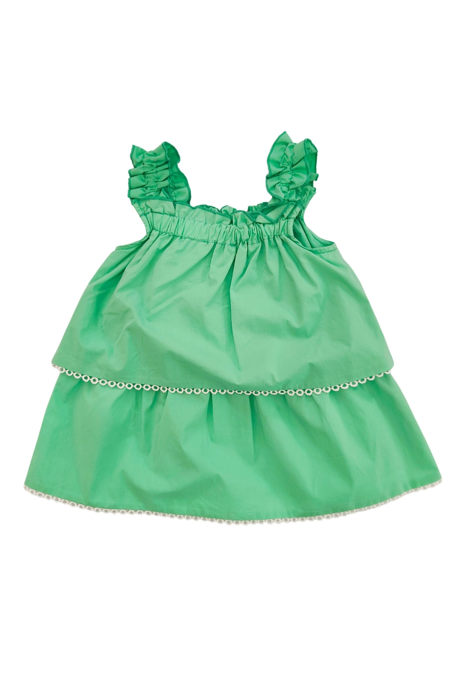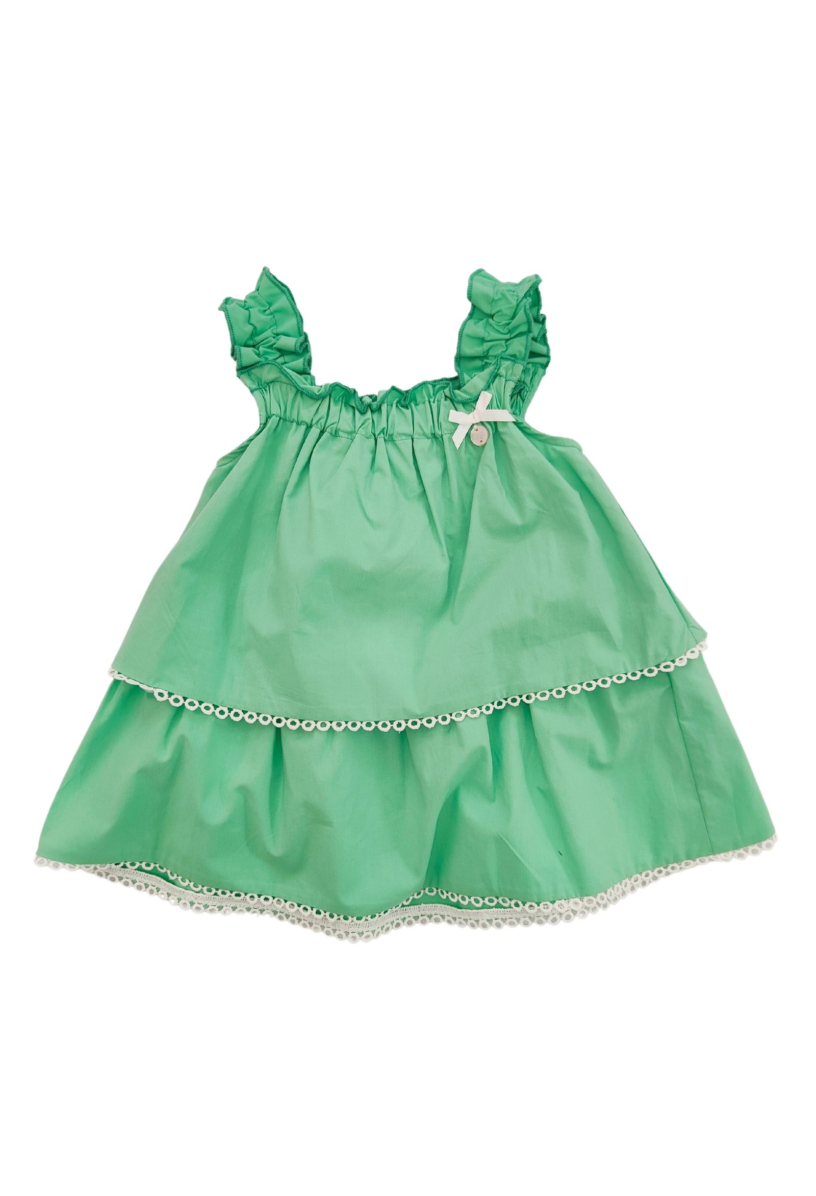 Abito per bambina a tinta unita con spalline larghe, orlo a cerchi, dettaglio decorazione fiocco posto nella parte frontale