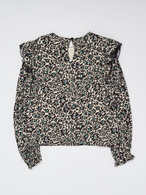Blusa realizzata in crêpe di viscosa con delicata stampa floreale e rouches sulle maniche decorate da applicazioni in pizzo. Modello versatile, da abbinare ad una gonna per un look glamour o ad un paio di jeans per un look più casual.