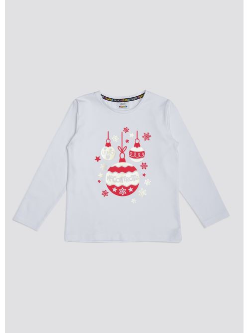 T-shirt bianca con stampa Christmas oro e rossa