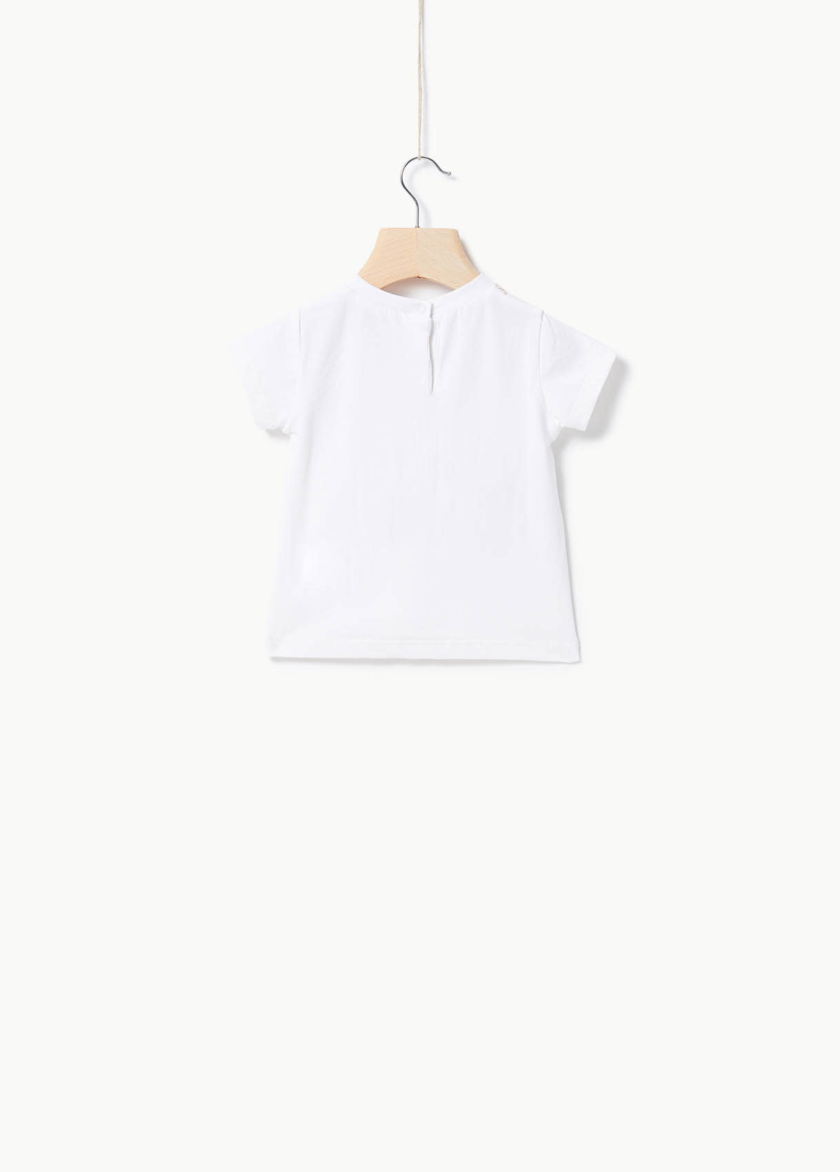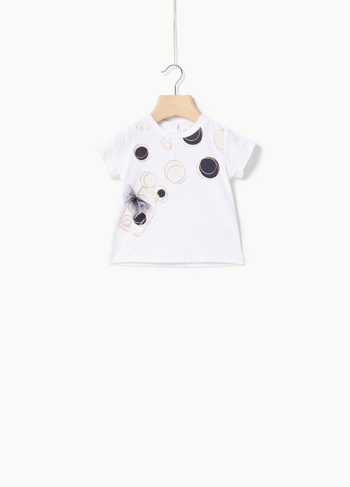 T-shirt bianca con stampa in contrasto ed applicazione in tulle.