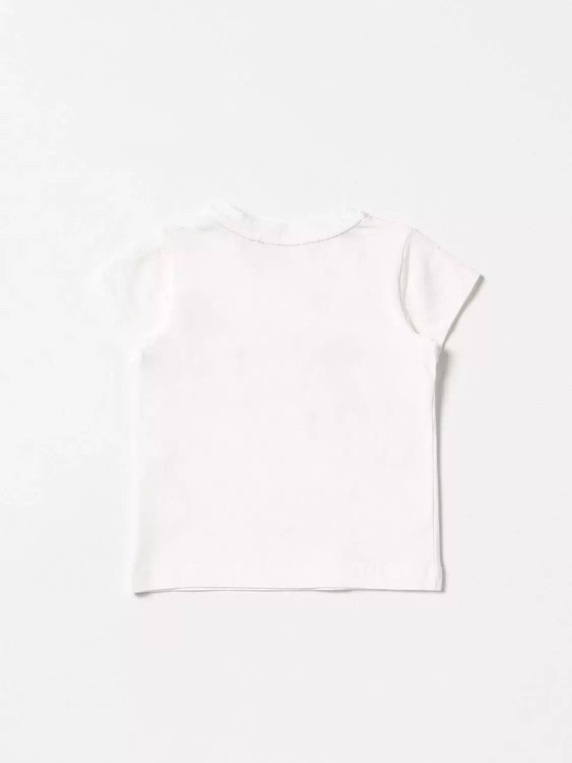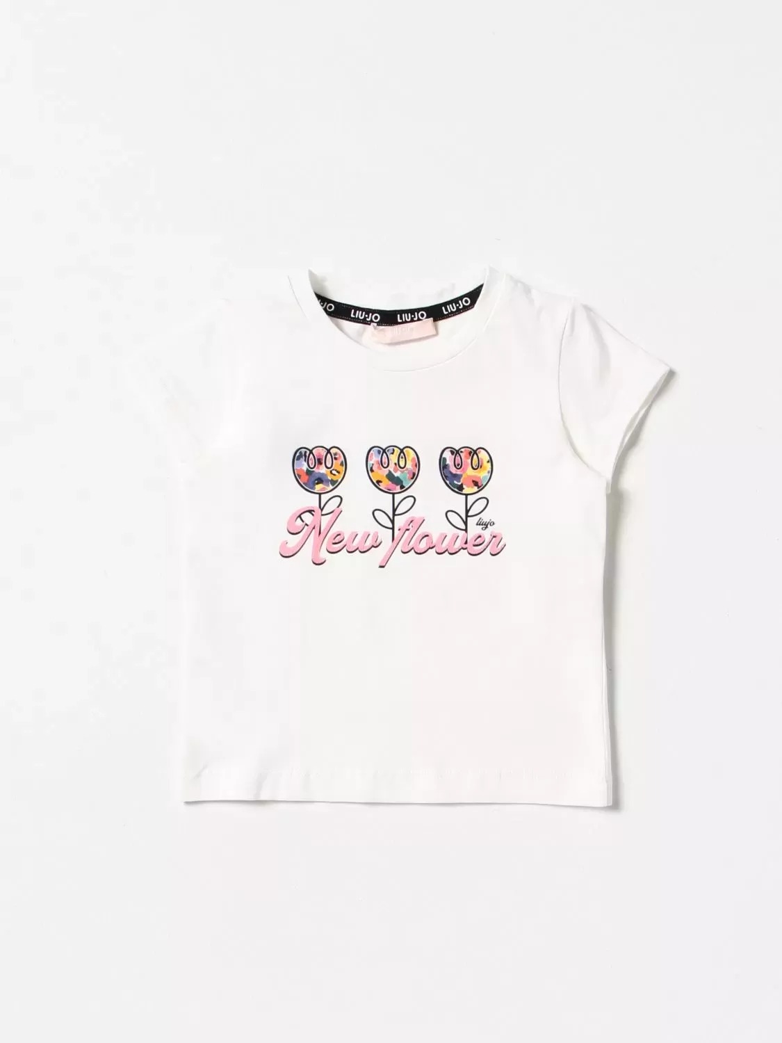 T-shirt bambina Liu Jo, modello girocollo, maniche corte, dettaglio fiori in contrasto con scritta, colore bianco