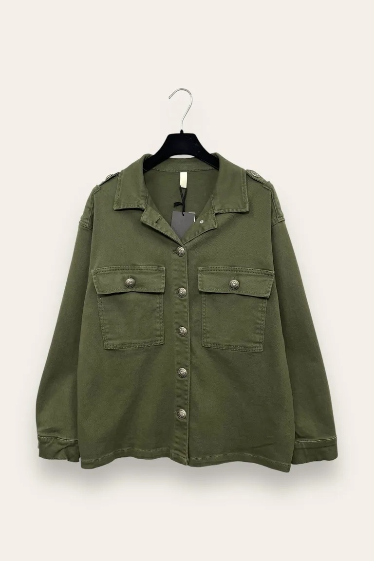 Giacca a camicia over in denim, con tasconi e bottoni gioiello