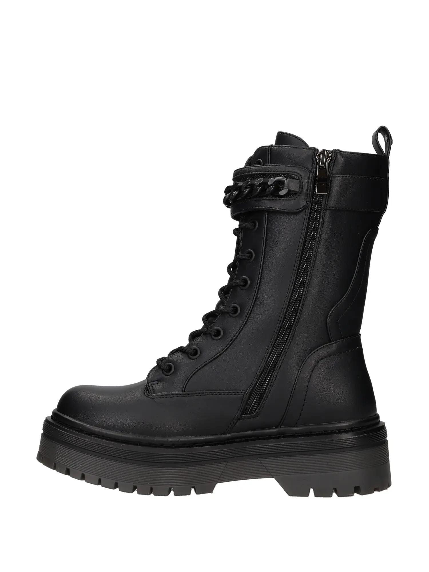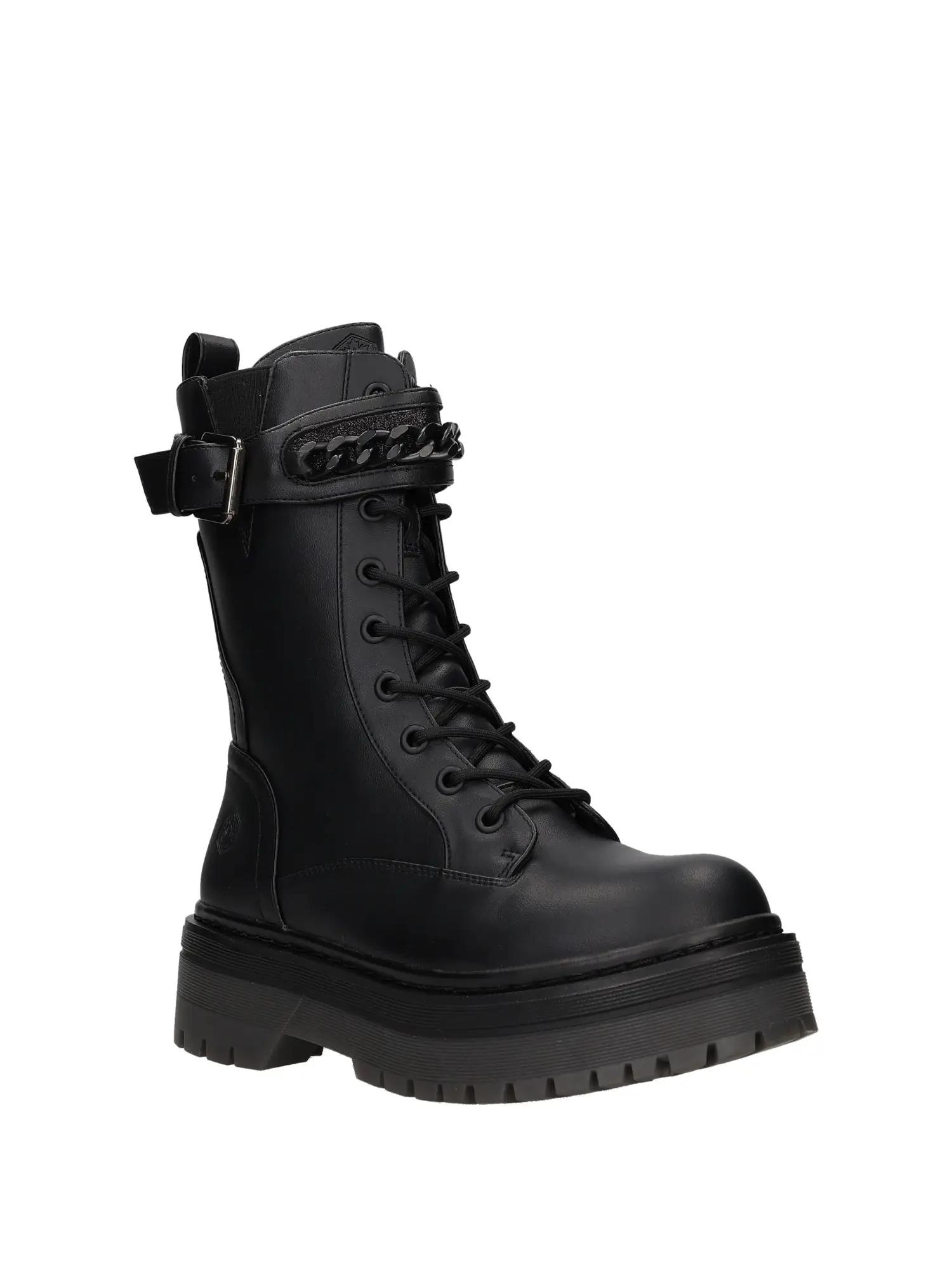 Anfibi donna in pelle nera con allacciatura frontale, fibbia alla caviglia e tacco medio con suola carrarmato.