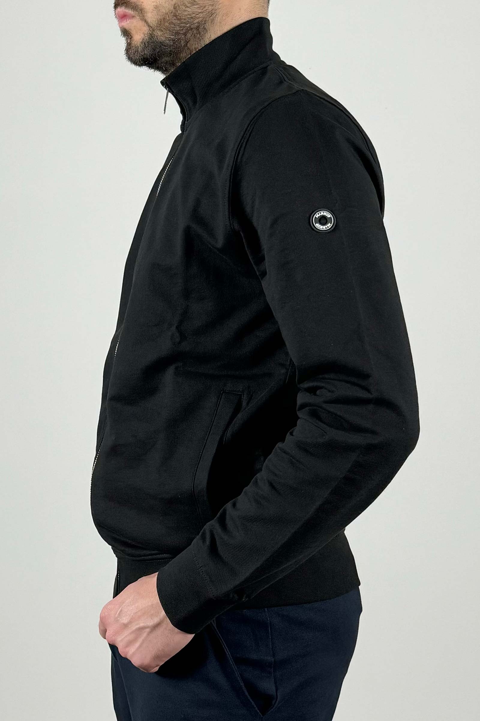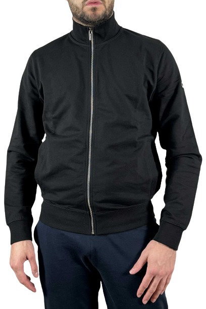 Felpa dall'effetto opaco con chiusura a zip centrale a contrasto colore, maniche lunghe con polsini elasticizzati, collo alto, tasche laterali