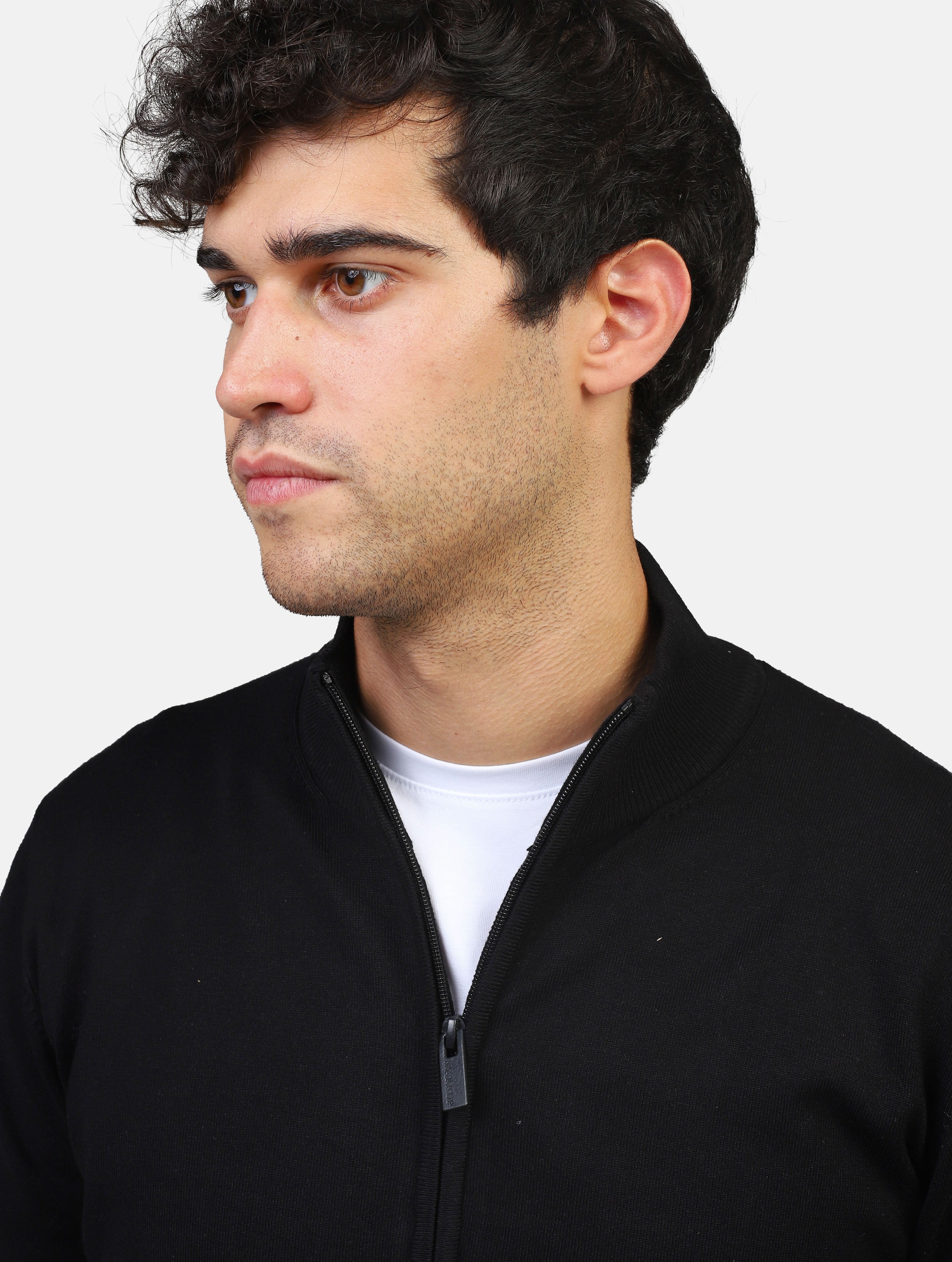 Maglia con chiusura a zip centrale e maniche lunghe, collo alto con polsini e balza