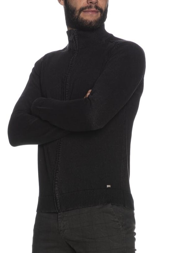 Cardigan da uomo in filato rasato di puro cotone tinto in capo per una finitura di colore unica, a manica lunga, con collo alto riporti sulle spalle polsini e cannolè a costine, chiusura centrale full zip a scomparsa e micro placchetta logo in acciaio applicata laterale sul fondo.