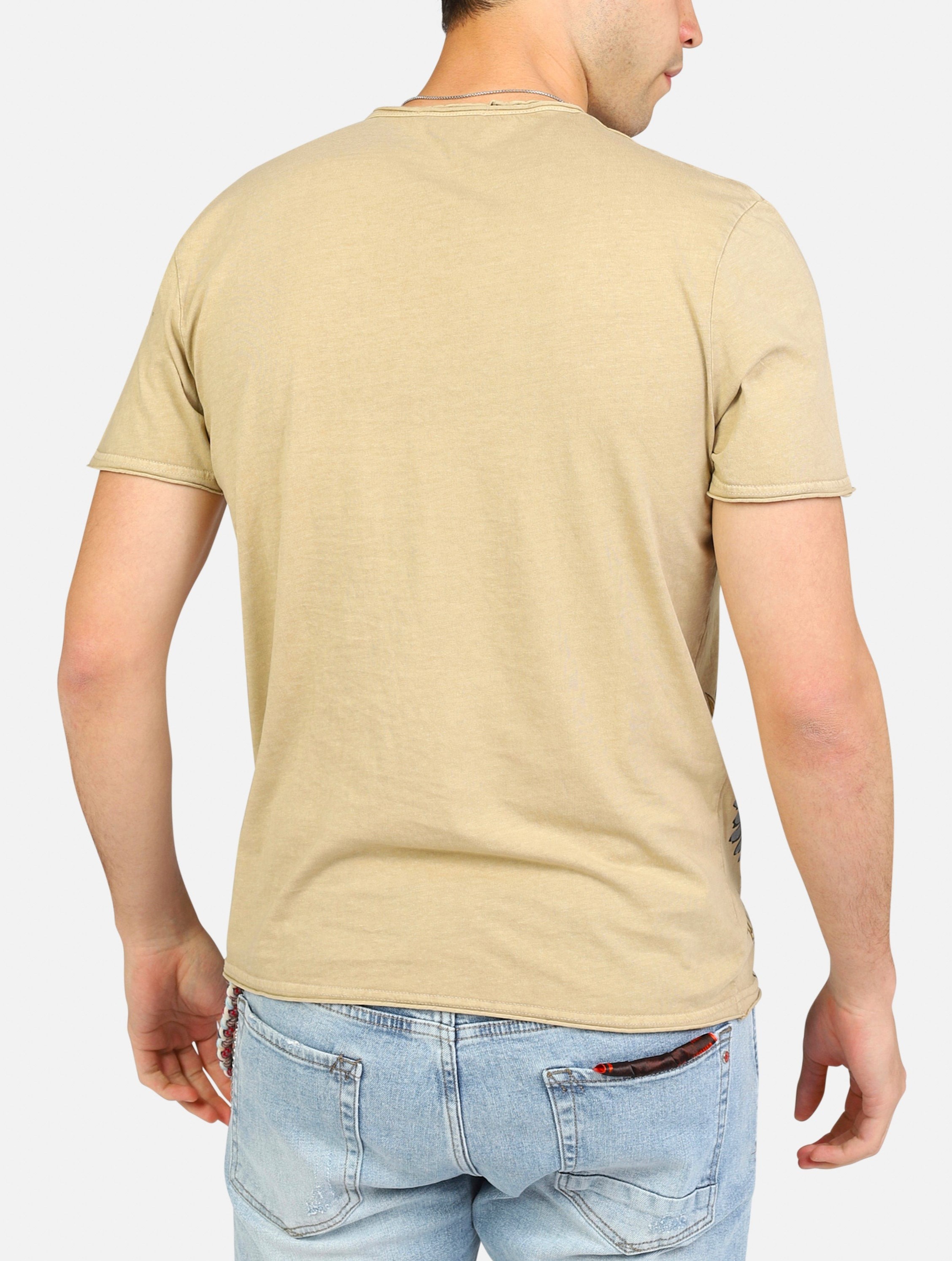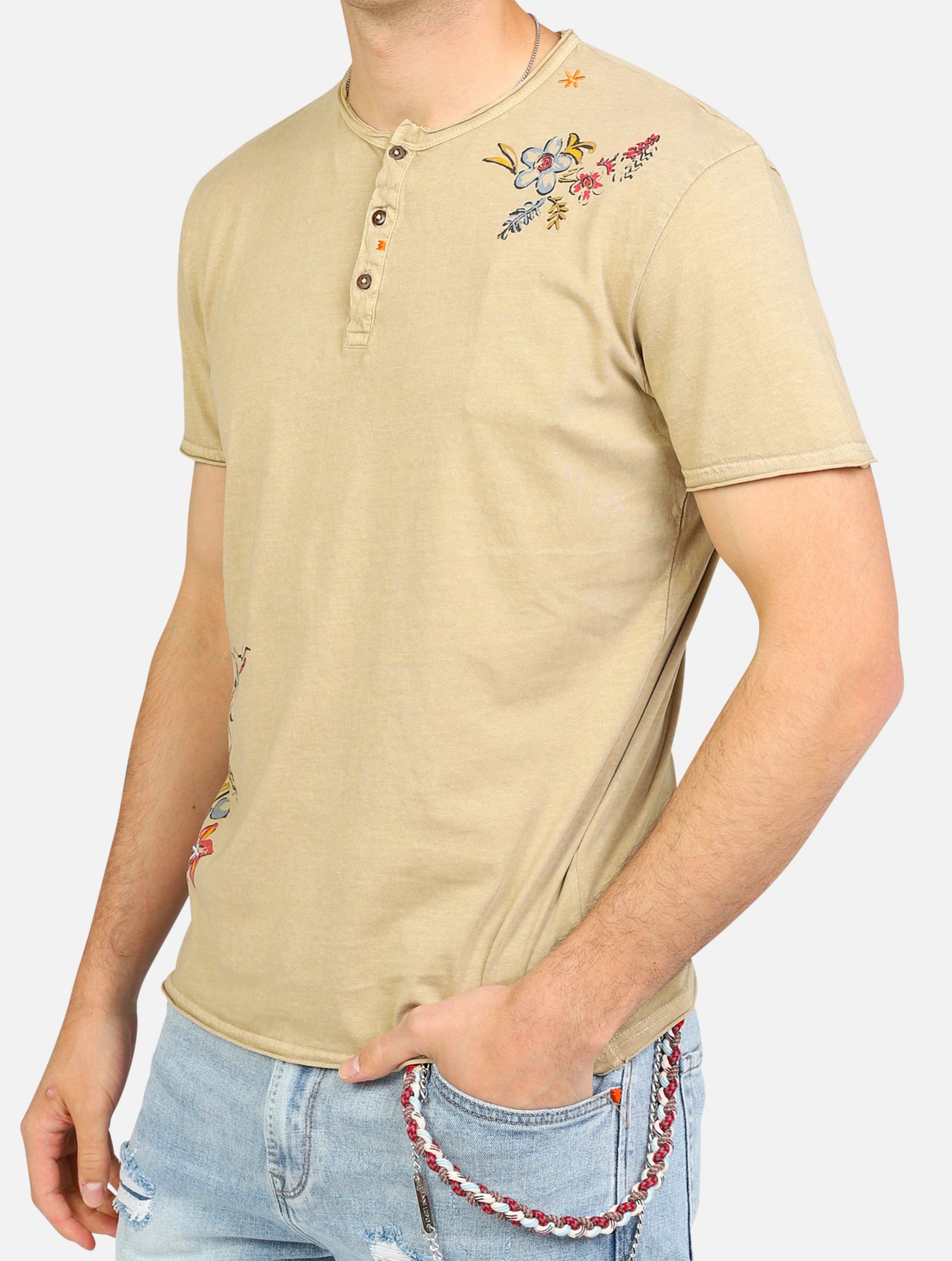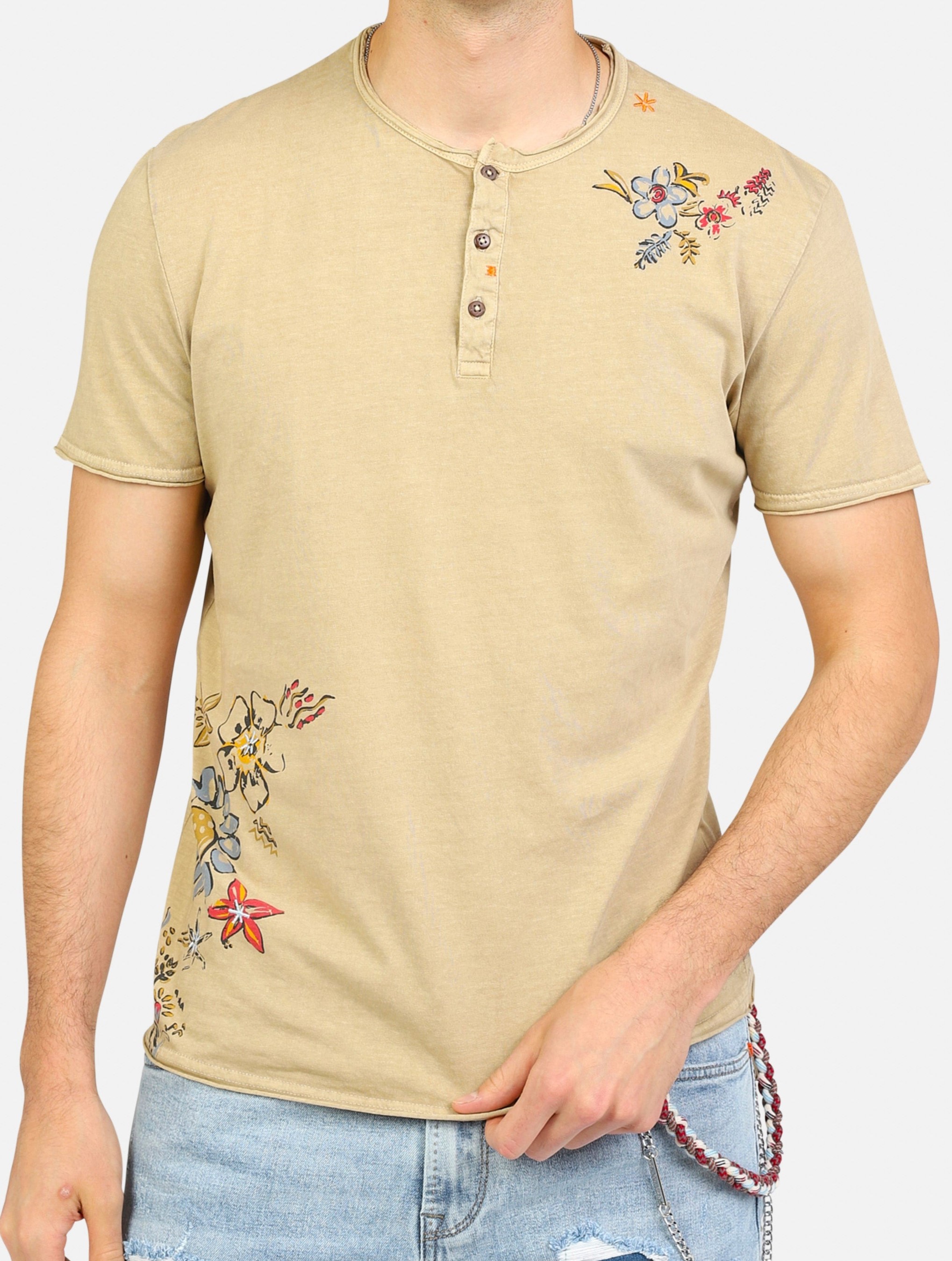 T-shirt a maniche corte con chiusura 3 bottoni presenti su girocollo, orlo dritto, fantasia a tema floreale posta in vicinanza della spalla