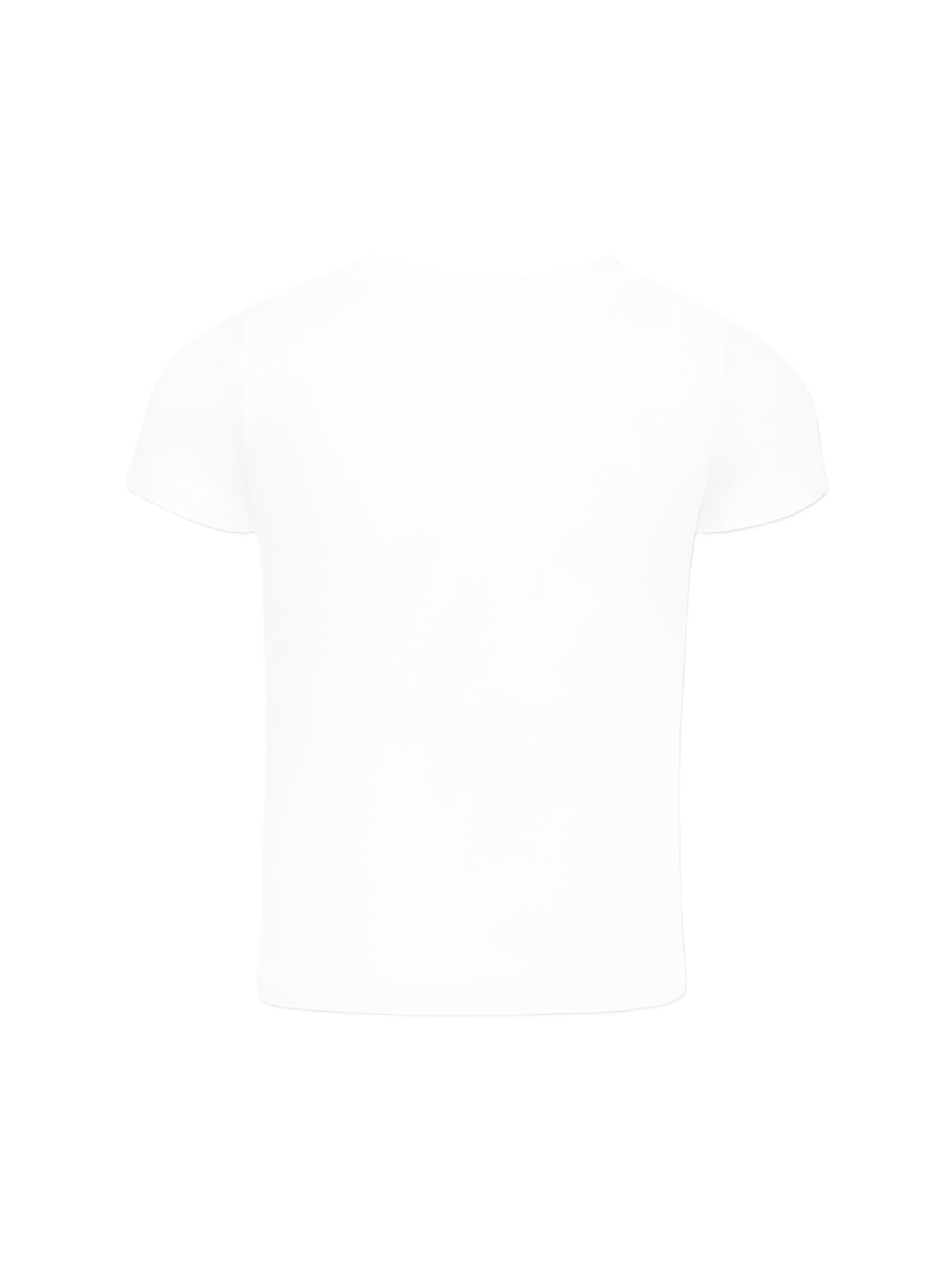 T-shirt avorio in misto cotone, con maniche corte e girocollo a costine. È decorata con logo oro stampato sul davanti.