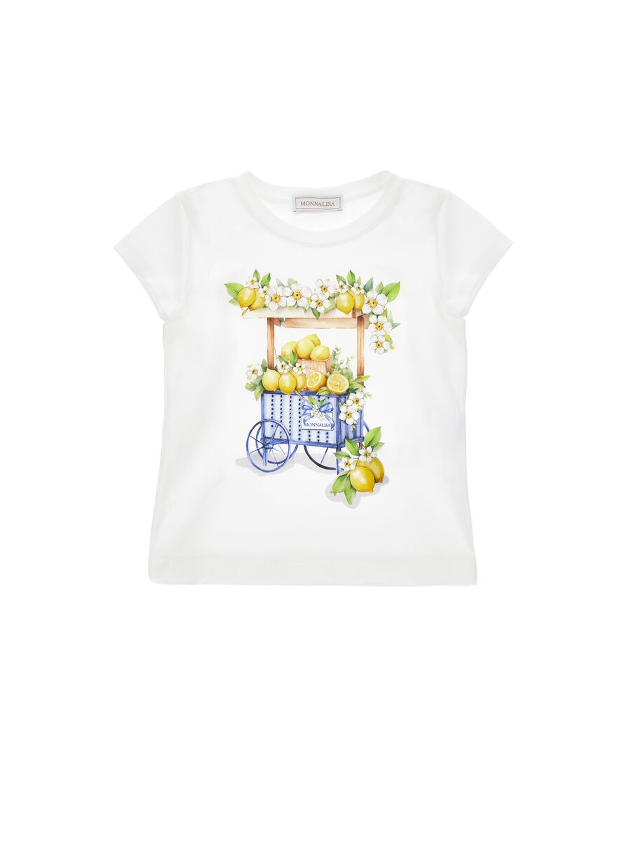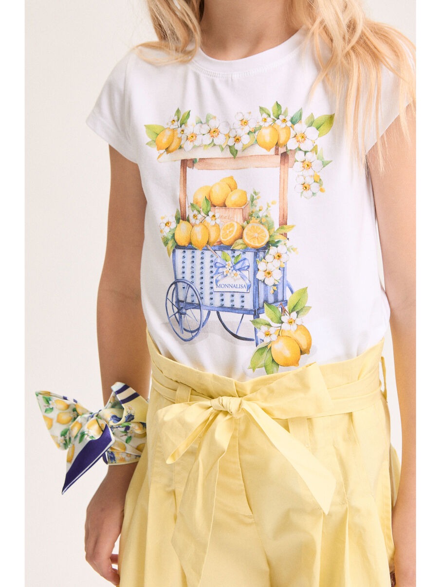 T-shirt ideale per dare un tocco di freschezza al guardaroba della tua bambina. Perfetta per giornate primaverili, con stampa "Carretto e limoni " evoca la dolcezza e la vitalità dei mercati italiani. Ideale per picnic e pomeriggi al parco.