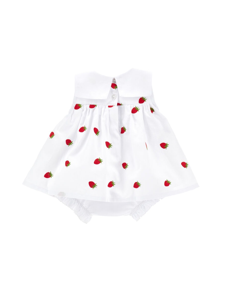 Delizioso abito pagliacetto decorato con un ricamo di fragole e impreziosito da un grande fiocco, per un tocco di dolcezza nelle giornate speciali della tua bambina. Perfetto per occasioni informali o feste estive, è comodo e pratico da indossare grazie ai bottoni sul retro.