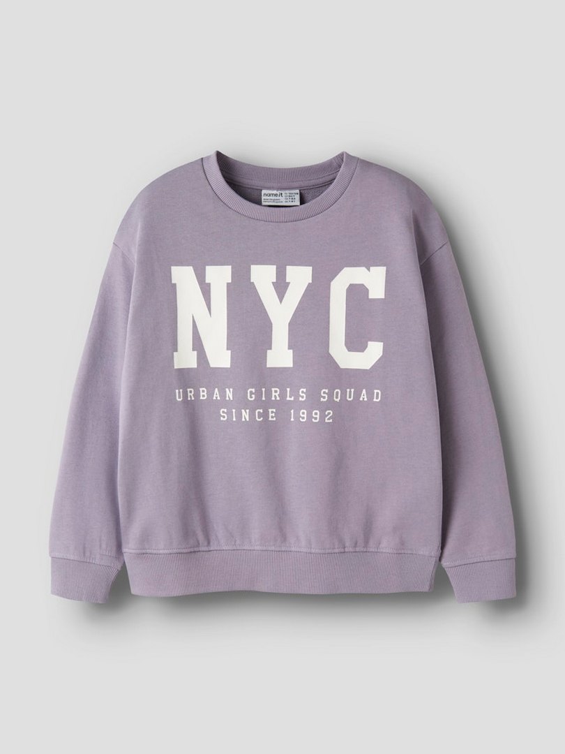 Felpa classica Name It con una grande stampa di testo sul davanti. La Felpa ha lo scollo tondo e le maniche lunghe con bordi a costine.