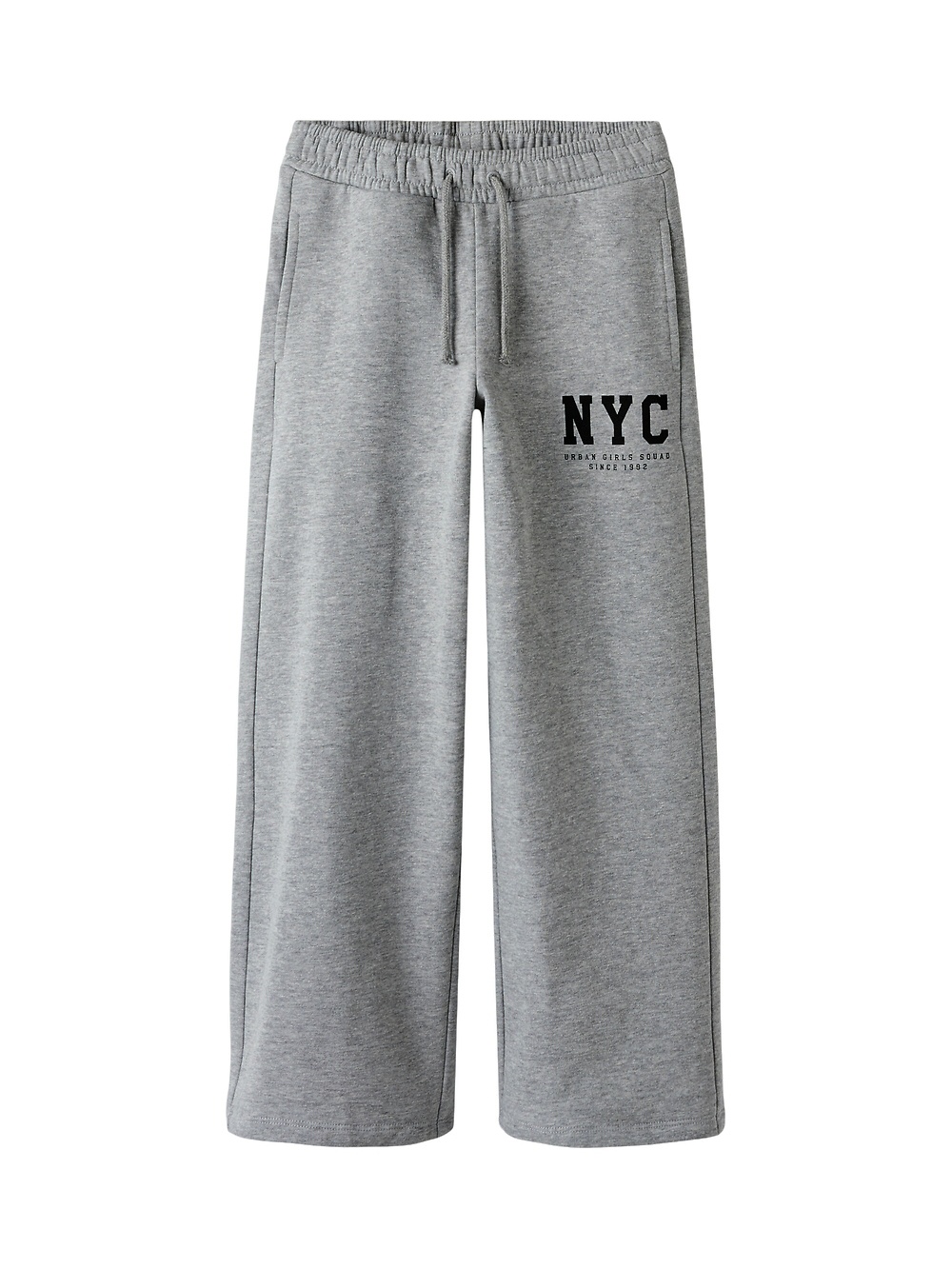 Eleganti pantaloni della tuta Name It in grigio melange con stampa nera "NYC" sulla coscia. I pantaloni della tuta Name It hanno una vita elastica che può essere regolata con bottoni interni. Ci sono lacci decorativi sul davanti e una tasca su ciascun lato. I pantaloni della tuta hanno una vestibilità comoda con gambe larghe.