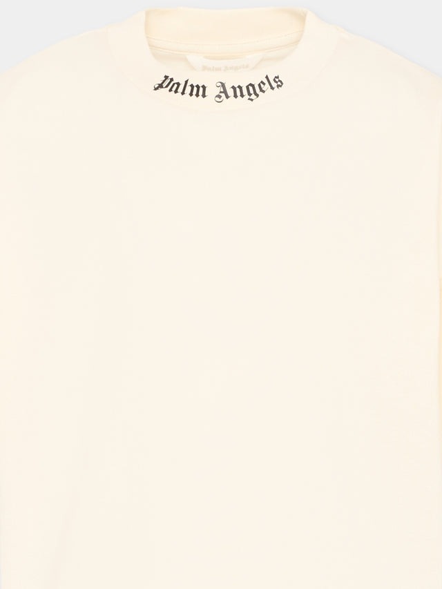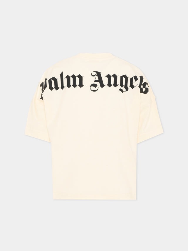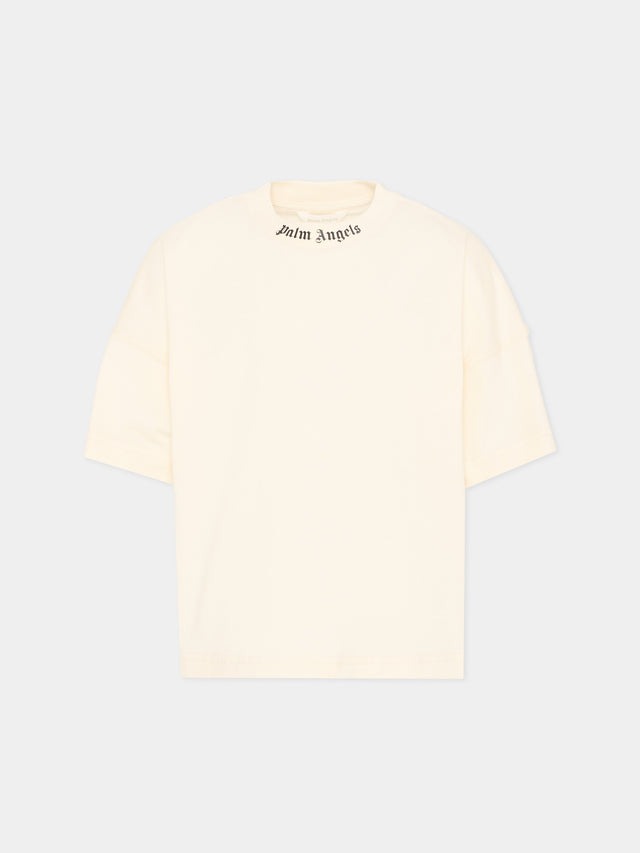 T-shirt a manica corta in jersey di cotone Palm Angels morbida e compatta al tatto. Il girocollo presenta una finitura pulita con logo Palm Angels stampato in piccolo sul davanti, mentre il maxi back-logo a contrasto nero richiama il DNA streetwear del brand. Le spalle scese e il volume leggermente ampio creano una linea rilassata che valorizza il carattere grafico delle stampe.