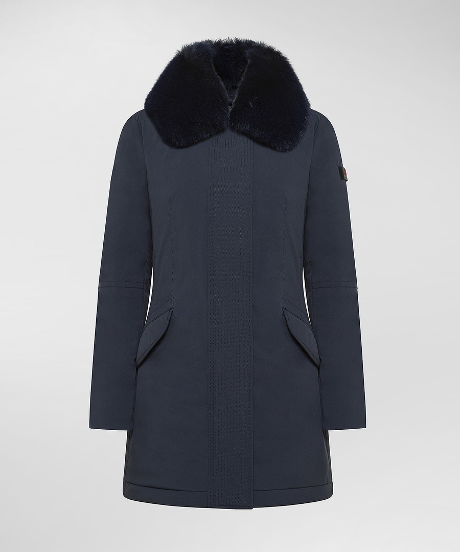 Piumino liscio in piuma riciclata e tela di nylon stretch, dotato di membrana performante e resistente a pioggia e vento. Il modello è impreziosito da un ampio collo in pelliccia di volpe staccabile, in tono colore e ha un impeccabile fit asciutto che valorizza la silhouette femminile. Collo a camicia, chiusura nascosta con zip a doppio cursore e bottoni. La moderna essenzialità del design fa di questo capo un must-have del guardaroba invernale. Versatile, consente molteplici abbinamenti e accompagna con stile impeccabile le diverse occasioni duso. Trattamento TeflonTM EcoElite.