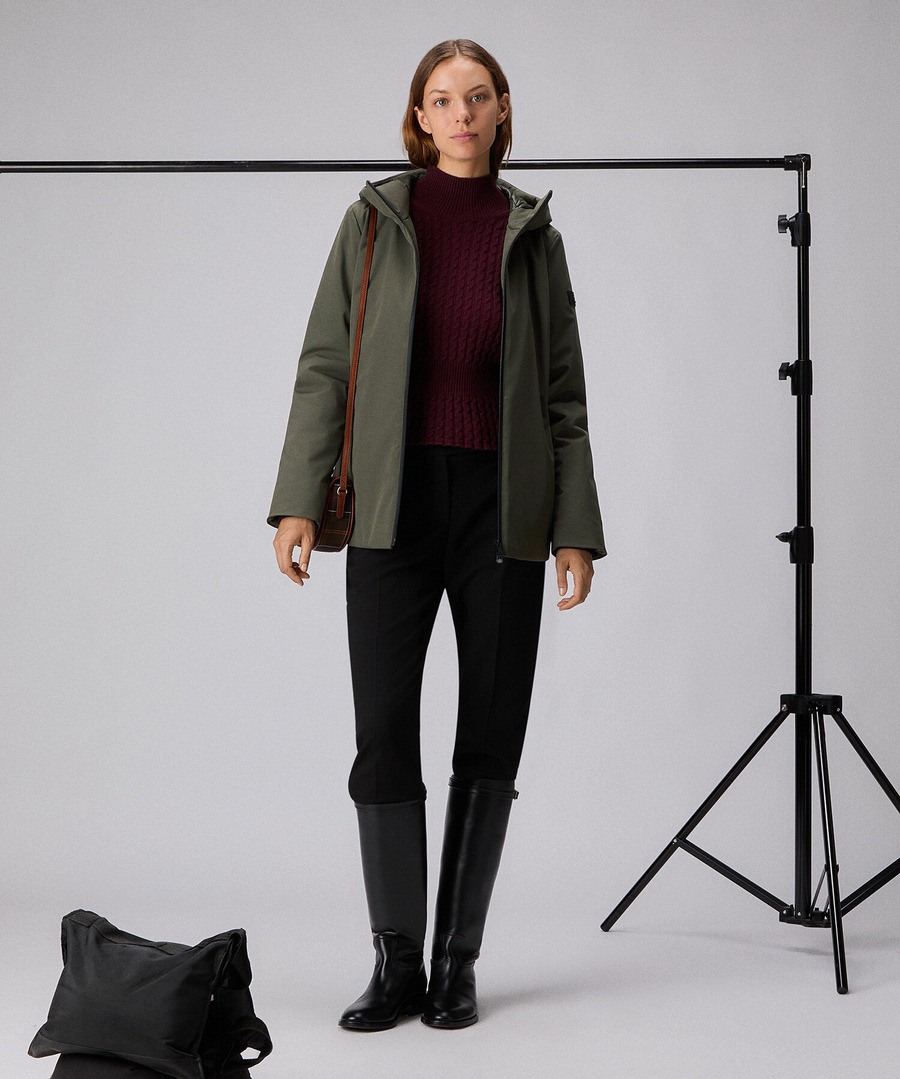 Giacca liscia, compatta e tecnica, realizzata in tela leggera di nylon bi-stretch accoppiata a un jersey interno morbido e confortevole. Il risultato è un capo elasticizzato, resistente e versatile, con imbottitura in materiale sintetico che garantisce calore e leggerezza. Il cappuccio fisso e i polsini antivento offrono una protezione ottimale, mentre i dettagli in contrasto colore aggiungono un accento grafico deciso. Un capo dal gusto active, senza rinunciare ad uno stile curato e femminile.