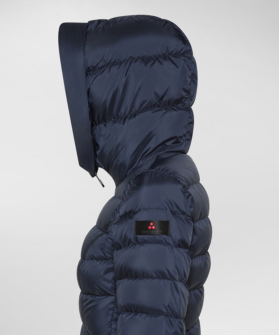 Piumino tecnico ultra leggero, realizzato in 100% poliestere riciclato post consumo, dalla mano morbida e dalla struttura super compatta, finitura opaca. L'imbottitura in piuma naturale certificata garantisce calore e protezione, mentre il trattamento idrorepellente PFC Free assicura una barriera efficace contro la pioggia leggera, senza l'uso di sostanze nocive per l'ambiente. Il fit asciutto e le trapunte differenziate, unite a un'impuntura in vita, valorizzano la silhouette con naturalezza. Il cappuccio fisso e il collo alto a cratere, full zip centrale con doppio cursore, completano un capo pensato per uno stile di vita attivo e trasversale, perfetto per molteplici abbinamenti.