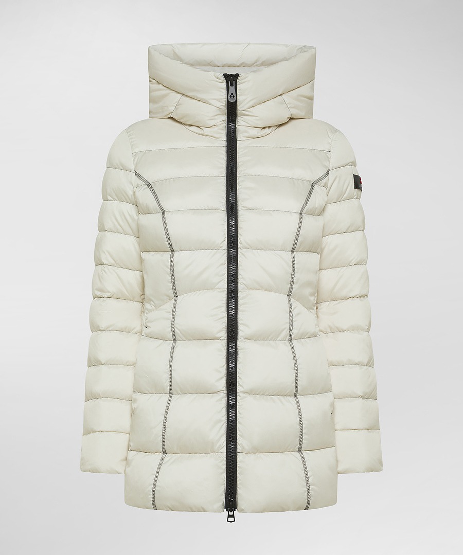 Piumino tecnico ultra leggero, realizzato in 100% poliestere riciclato post consumo, dalla mano morbida e dalla struttura super compatta, finitura opaca. Limbottitura in piuma naturale certificata garantisce calore e protezione, mentre il trattamento idrorepellente PFC Free assicura una barriera efficace contro la pioggia leggera, senza luso di sostanze nocive per lambiente. Il fit asciutto e le trapunte differenziate, unite a unimpuntura in vita, valorizzano la silhouette con naturalezza. Il cappuccio fisso e il collo alto a cratere, full zip centrale con doppio cursore, completano un capo pensato per uno stile di vita attivo e trasversale, perfetto per molteplici abbinamenti.