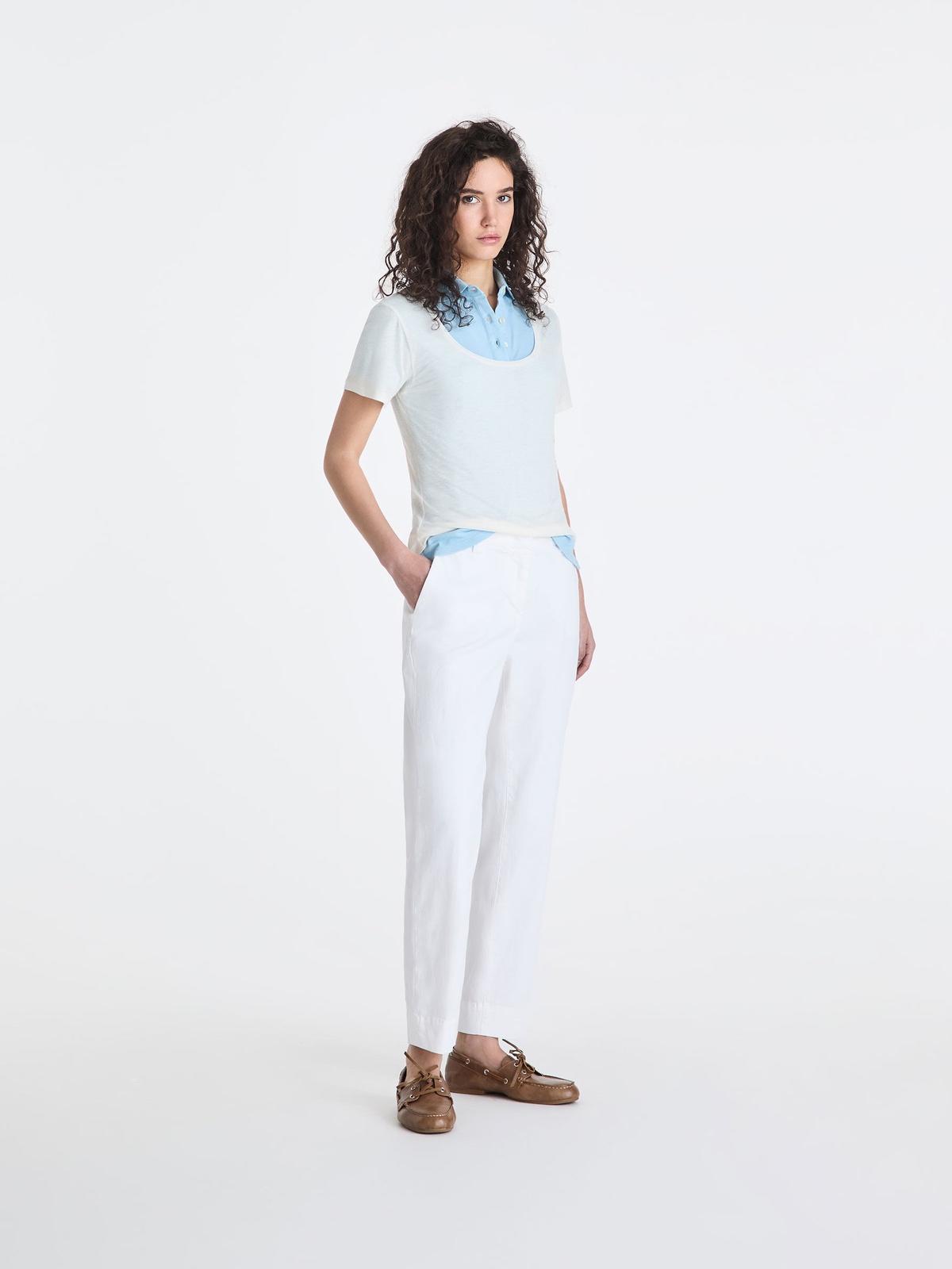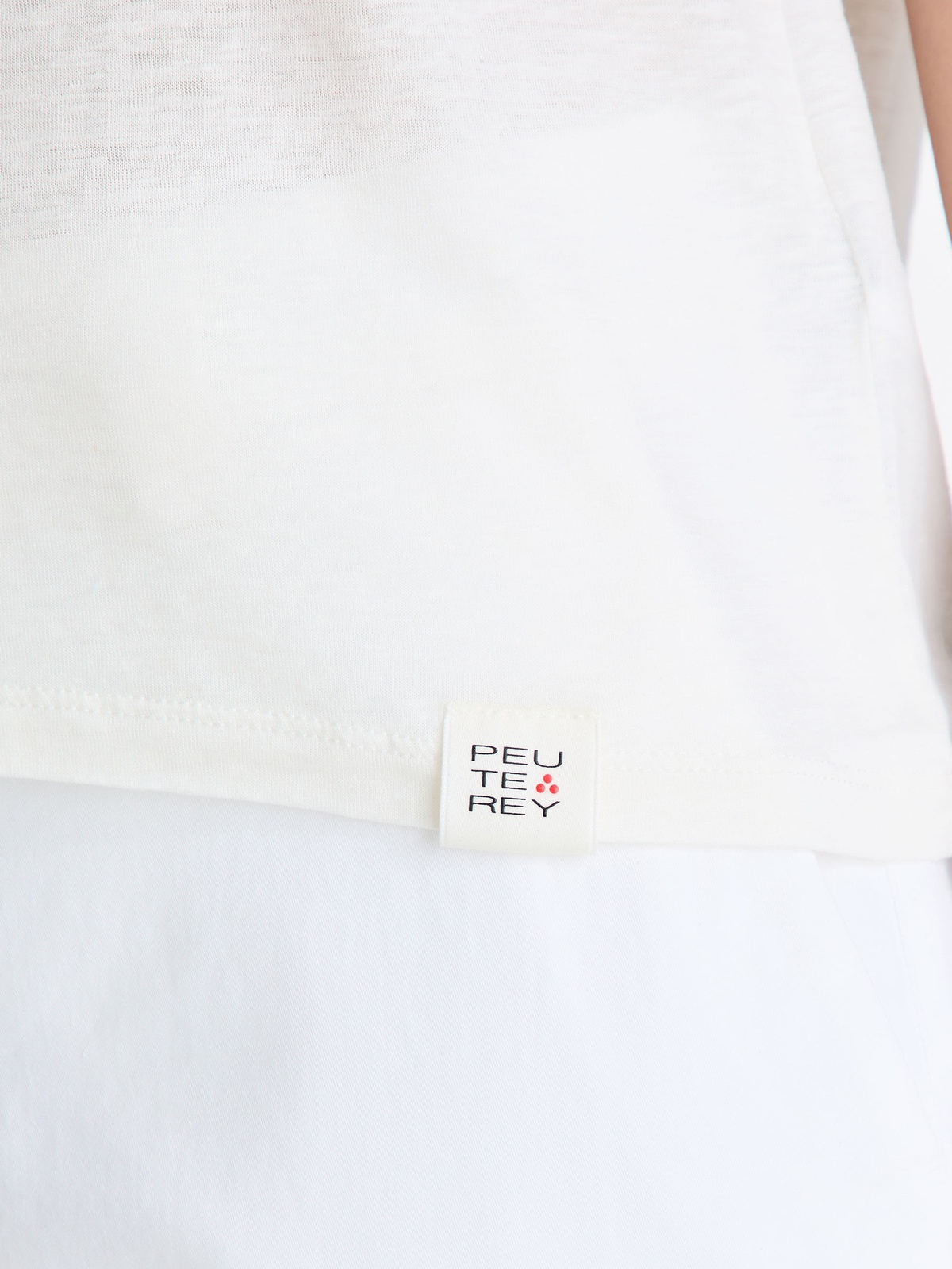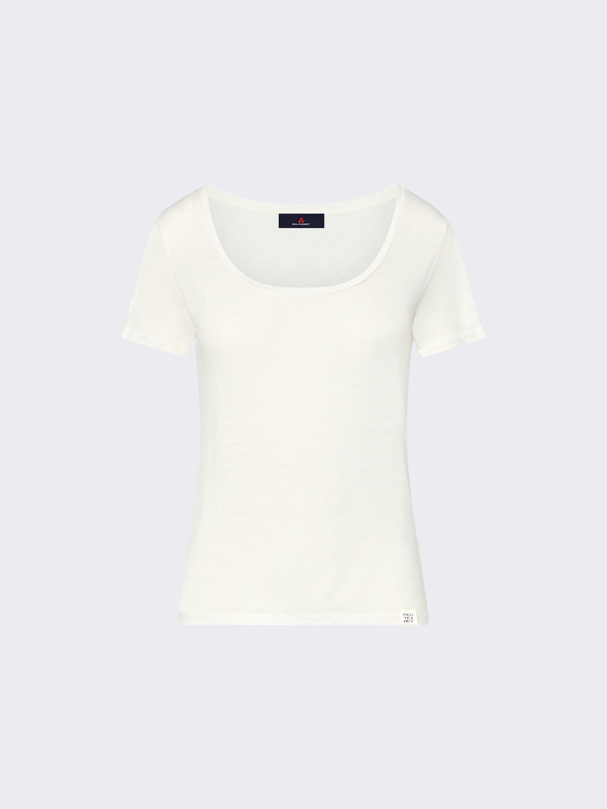 T-shirt in jersey di lino e modal, con ampio girocollo, maniche corte e fit leggermente avvitato che valorizza la silhouette. Rifinita con un'etichetta con logo sul fondo, unisce comfort e femminilità. Un capo femminile e confortevole, adatto ai look più casual e disinvolti, per farti notare con eleganza e semplicità.