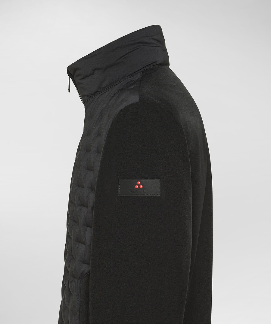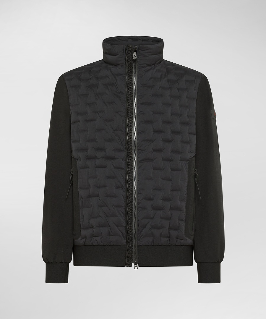 Bomber in doppio materiale: il tessuto primario è uno jacquard di poliestere stretch che, grazie a una speciale lavorazione di tintura, rivela contrasti di colore tra dritto e rovescio, per un effetto visivo unico e ricercato. Il tessuto secondario è un soft shell di nylon stretch accoppiato con un jersey di poliestere, soffice e caldo grazie alla finezza dei filati utilizzati. Parte dellconica linea Transeasonal, una rappresentazione del concetto urban in cui comfort, praticità e stile si uniscono a uno studio approfondito dei materiali e dei pesi dando vita a capi versatili e adatti a ogni stagione. Il design è arricchito da una distintiva trapunta geometrica, maniche lisce e dettagli neri in contrasto e linee essenziali. La chiusura centrale con doppia zip che assicura comfort e praticità, le tasche laterali a filetto e il fondo e i polsini in tessuto nero rifiniscono il look. Imbottito in piuma naturale certificata, idrorepellente, è il capo ideale per chi cerca uno stile urbano moderno perfetto per affrontare la città con un tocco di carattere.