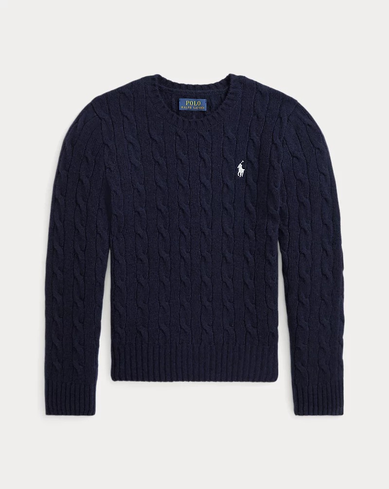 Capo classico per i mesi più freddi, questa maglia dalla lavorazione a trecce in misto lana e cashmere di peso medio è ricamata con il nostro esclusivo pony.