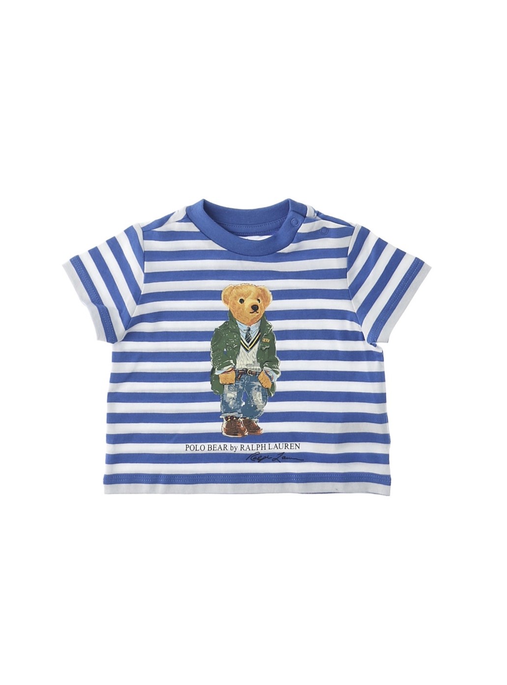 T-shirt girocollo a maniche corte, stampa logo frontale, chiusura con bottoni a pressione sulla spalla sinistra