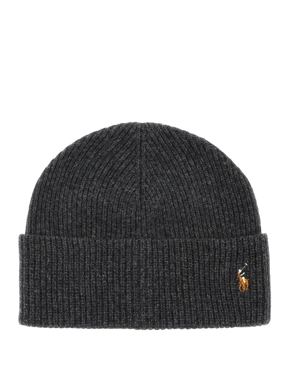 Cuffia uomo in maglia di misto lana a costine, con risvolto regolabile e iconico pony Polo Ralph Lauren ricamato sul fronte.