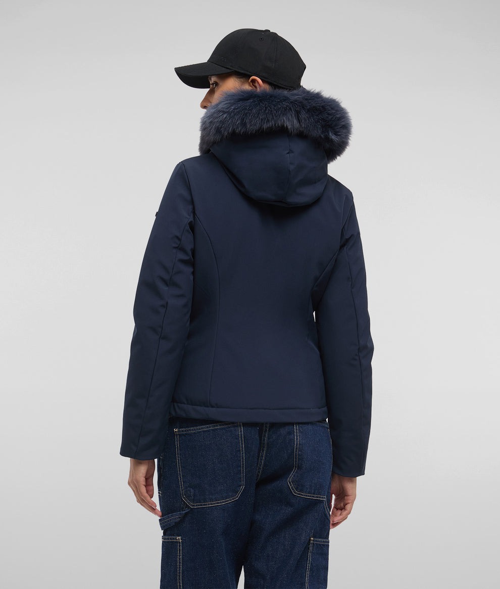 La Short Lady Tech Jacket è un giubbotto invernale da Donna estremamente caldo e confortevole, perfetto per la stagione fredda. Guscio esterno in soft-shell tecnico con trattamento idrorepellente ed antivento. Ideale da indossare in qualsiasi occasione, sia in ambito urbano per la vita di tutti i giorni, che outdoor in montagna o durante unescursione. Imbottitura termica RefrigiWear® 100% animal-free che assicura una traspirabilità eccellente ed una tenuta termica formidabile. Capo dotato di cappuccio antipioggia regolabile tramite coulisse e con bordo in pelliccia, due tasche frontali con zip a scomparsa. Chiusura frontale con zip a doppio cursore nascosta da pattina con bottoni, per un look raffinato e pulito. Placca logo in metallo sul braccio. Questo giubbotto da Donna è davvero il capo da avere nel guardaroba invernale. Una volta provato, non potrai più farne a meno.