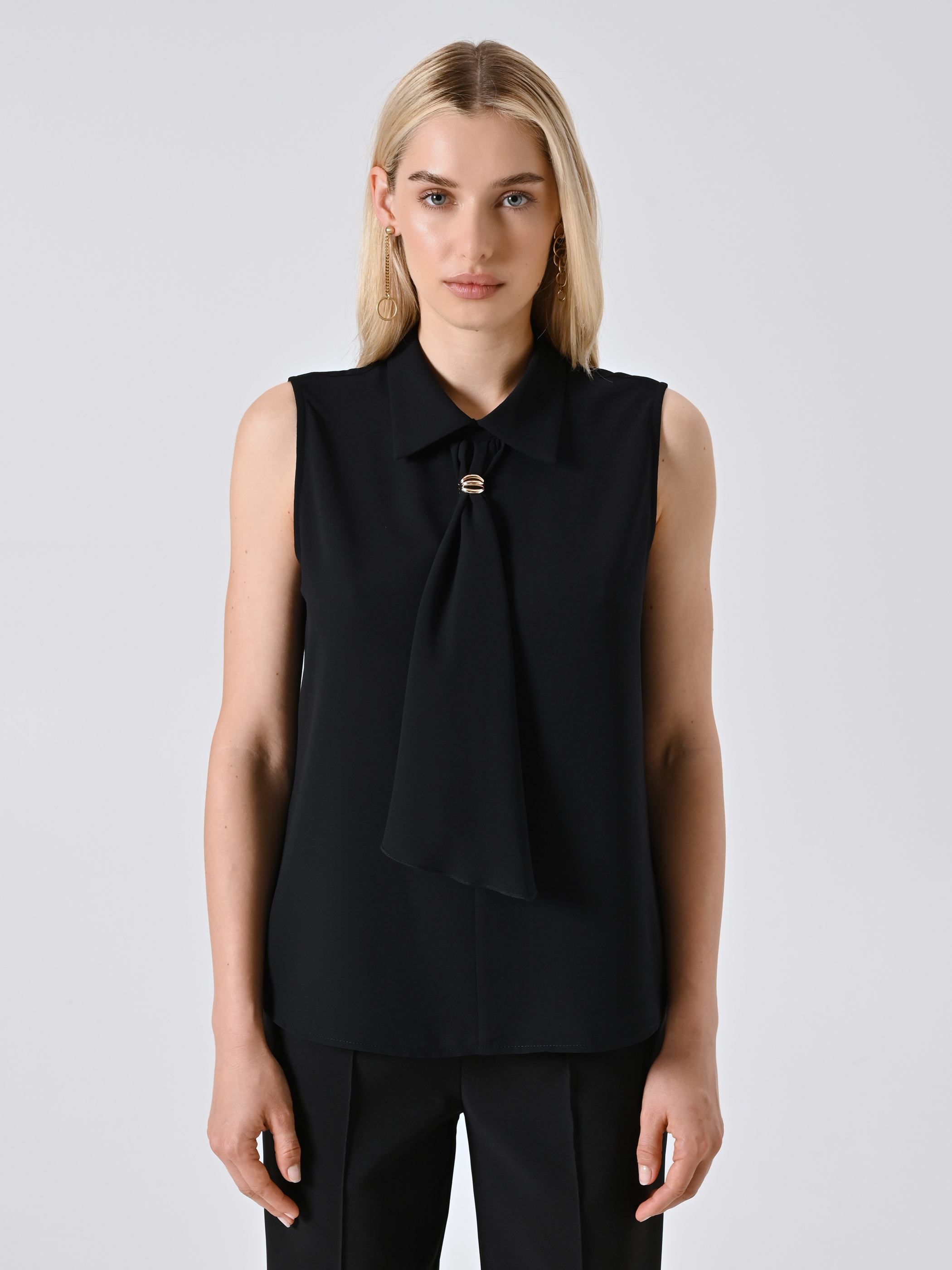 Realizzato in crepe georgette, il Top con Colletto Lavalliere si distingue per il colletto con lavallière impreziosita da un delicato dettaglio gioiello e per la chiusura con bottoni tono su tono, che ne esaltano lo stile raffinato e femminile.