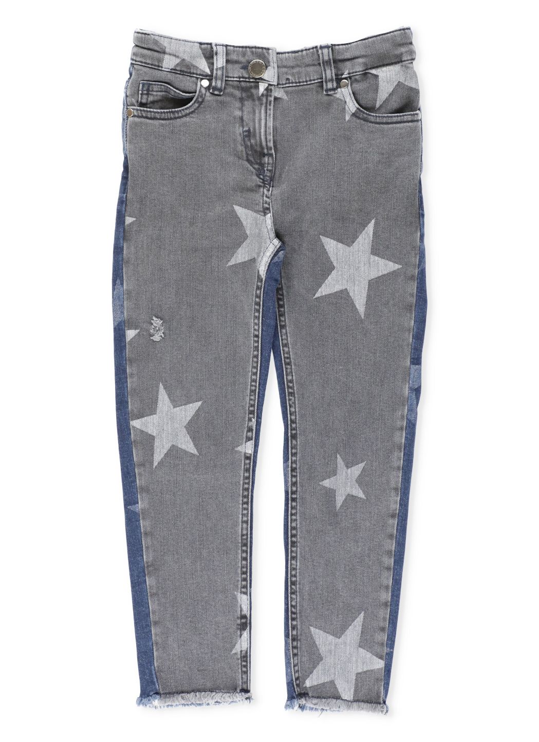 Nero, cotone biologico, stampa stelle, vestibilità slim, chiusura con bottoni, passanti per cintura e cinque tasche.