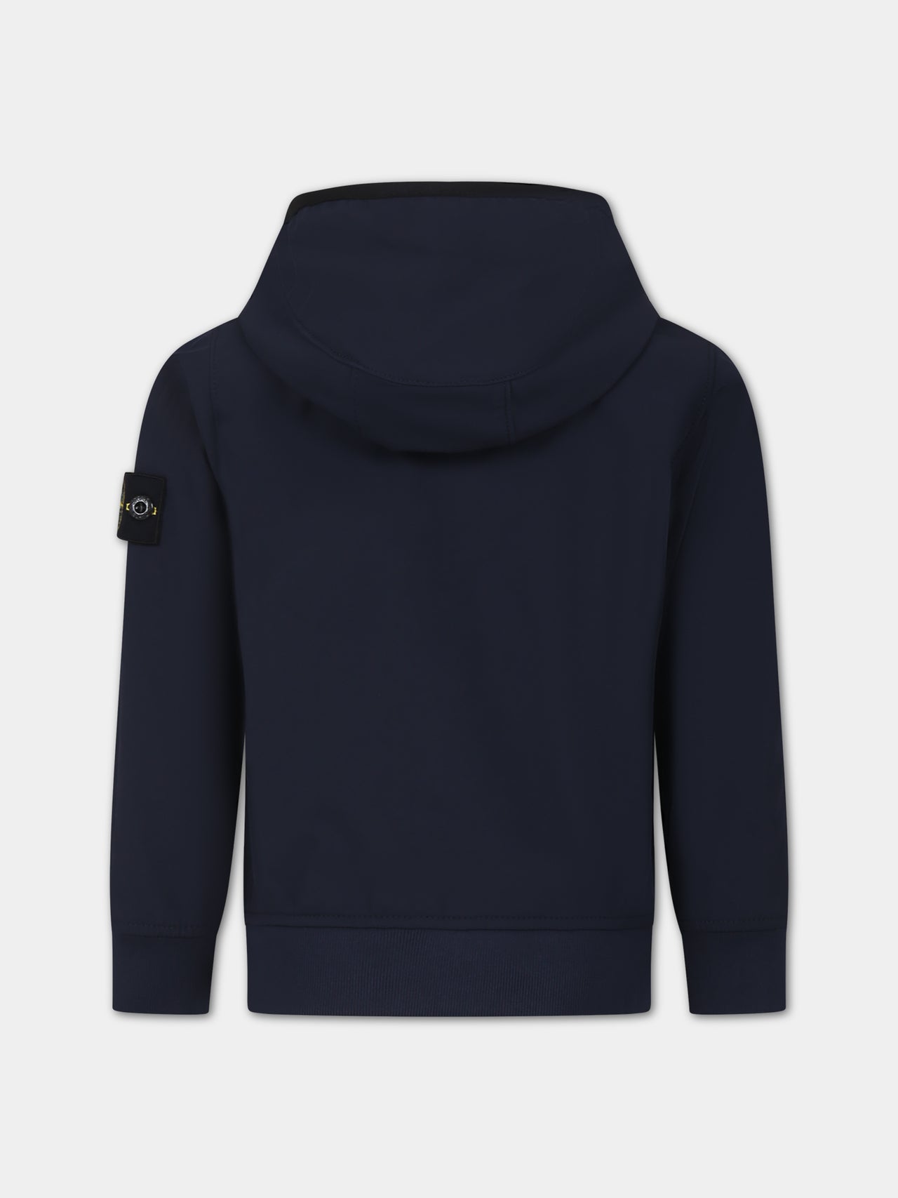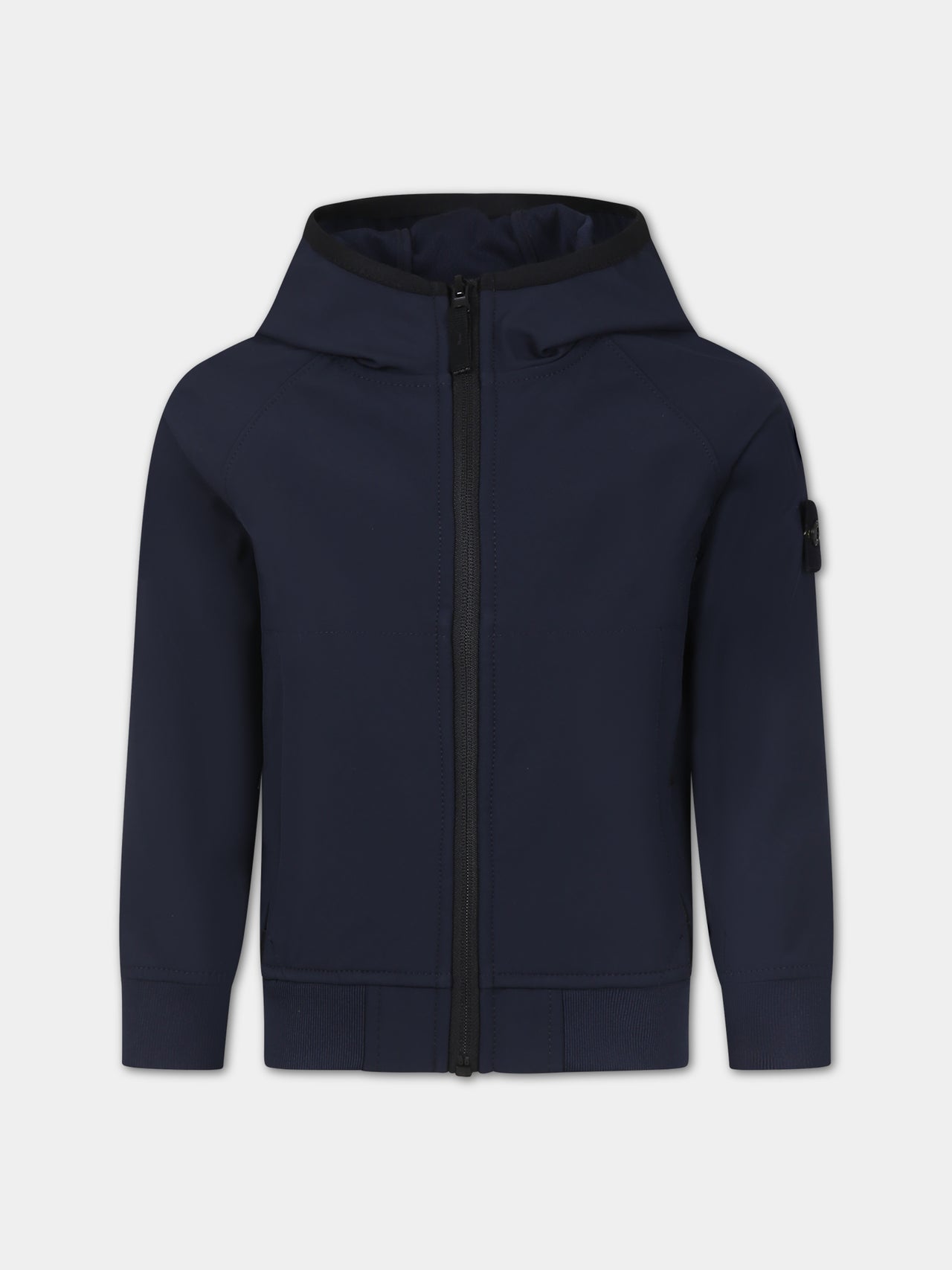 Giubbotto blu in tessuto leggero, a maniche lunghe, chiusura frontale con zip, con cappuccio, tasche laterali con chiusura a zip. E' decorato con iconica bussola con logo sulla manica.