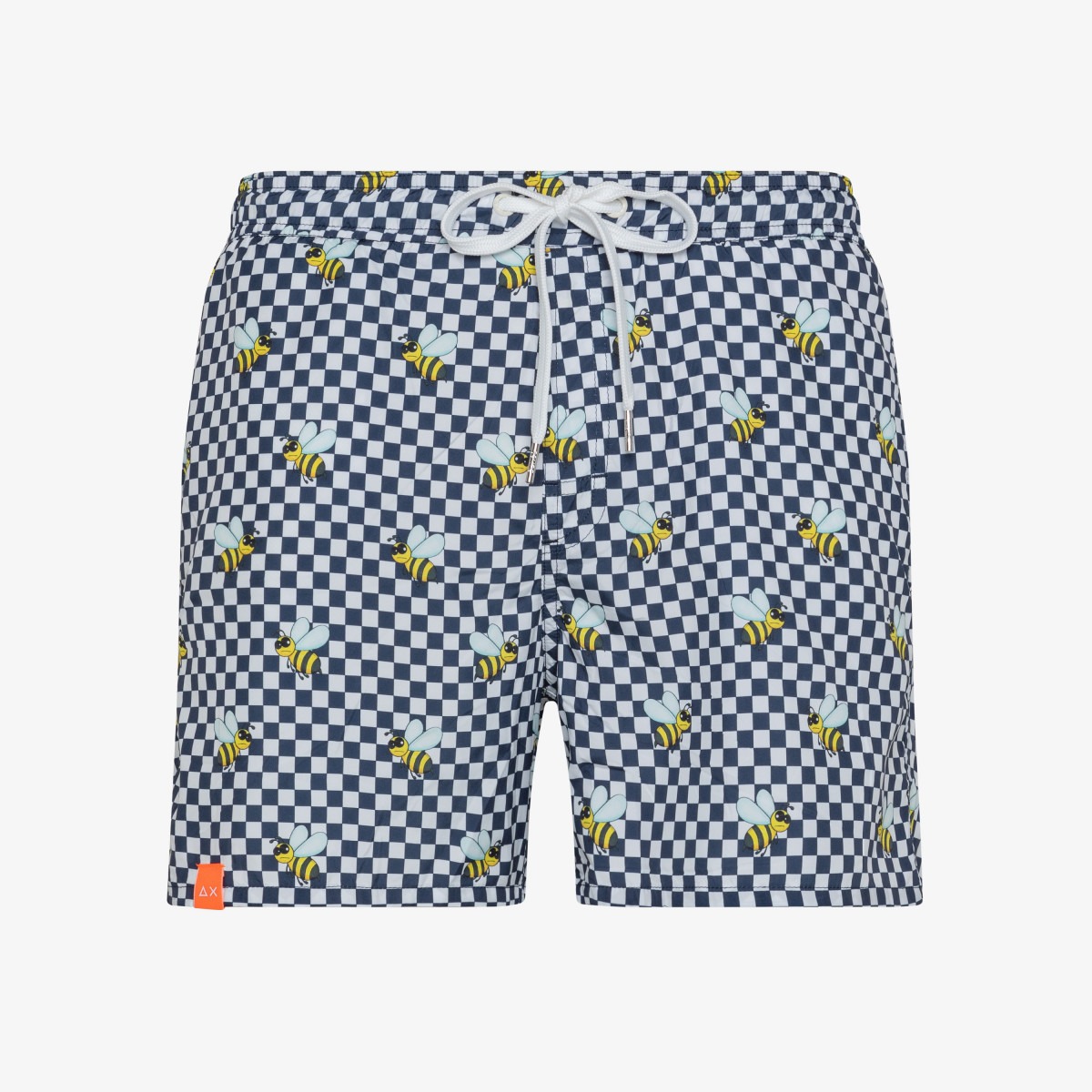 Costume da bagno con fantasia all-over a scacchiera e paperelle, chiusura modello tramite lacci, vita elasticizzata, tasca posteriore
