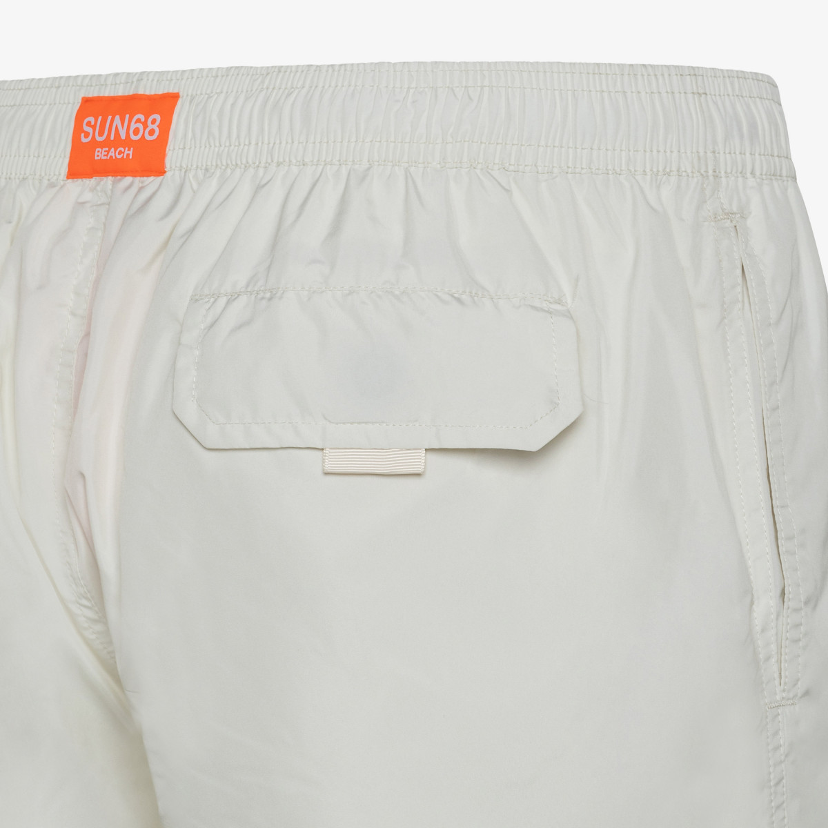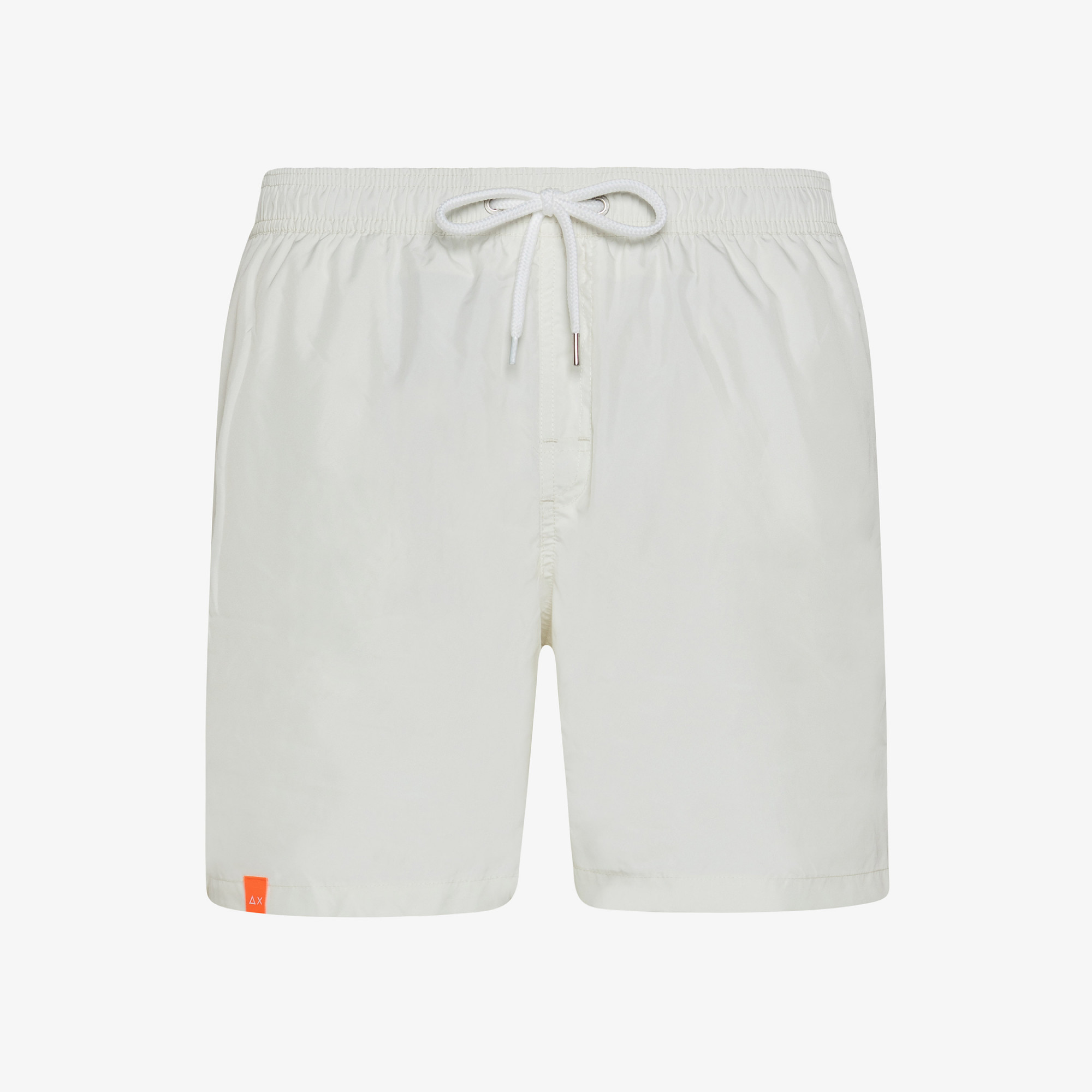 Costume da bagno a tinta unita con targhetta laterale loggata a contrasto colore, chiusura tramite lacci e vita elasticizzata, taschino posteiore