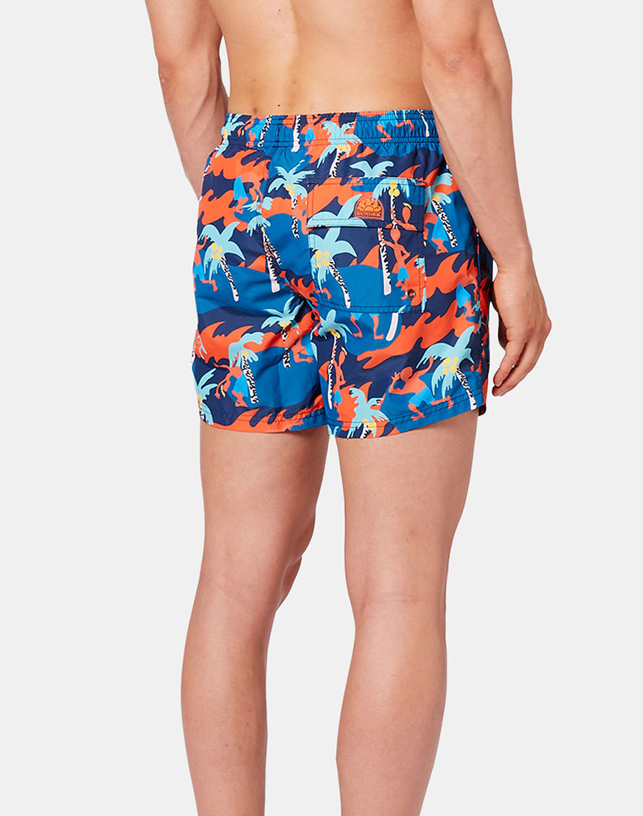 La fantasia tropicale multicolore della stama d'archivio Funny Island è il segno distintivo di questo costume uomo pantaloncino corto.